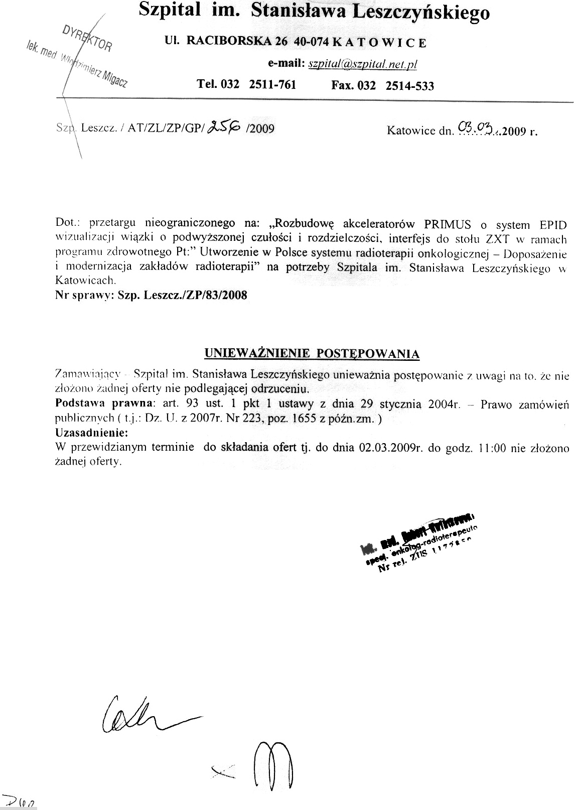 do dnia 02.03.2009r. do godz. 11.00 w Szpitalu im. Stanisława Leszczyńskiego, 40-074 Katowice, ul. Raciborska 26, w Kancelarii Dyrektora.