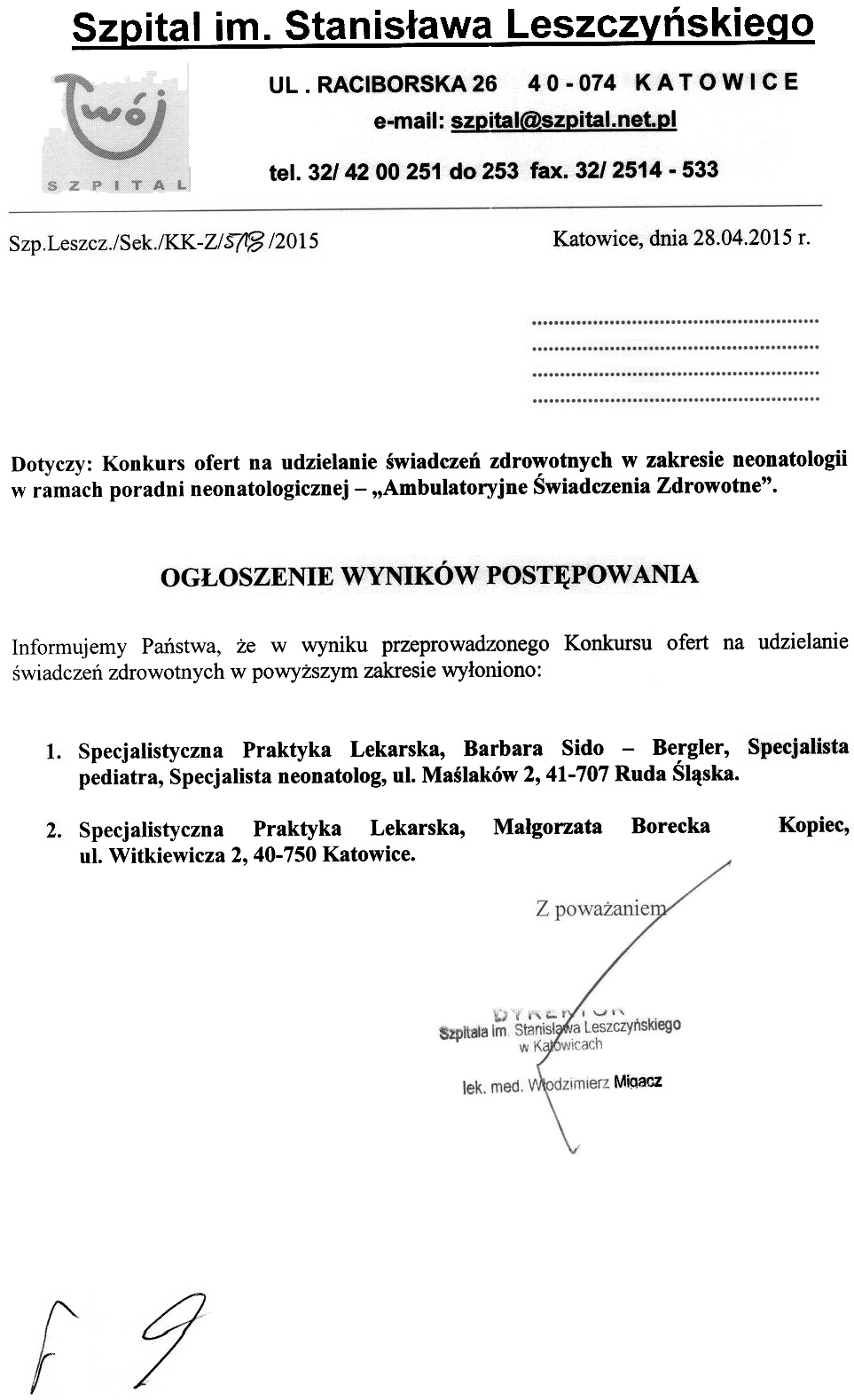 - Oferty należy składać w Kancelarii Szpitala im. Stanisława Leszczyńskiego w Katowicach ul. Raciborska 26 do dnia 27.04.2015 r. do godz. 09.30