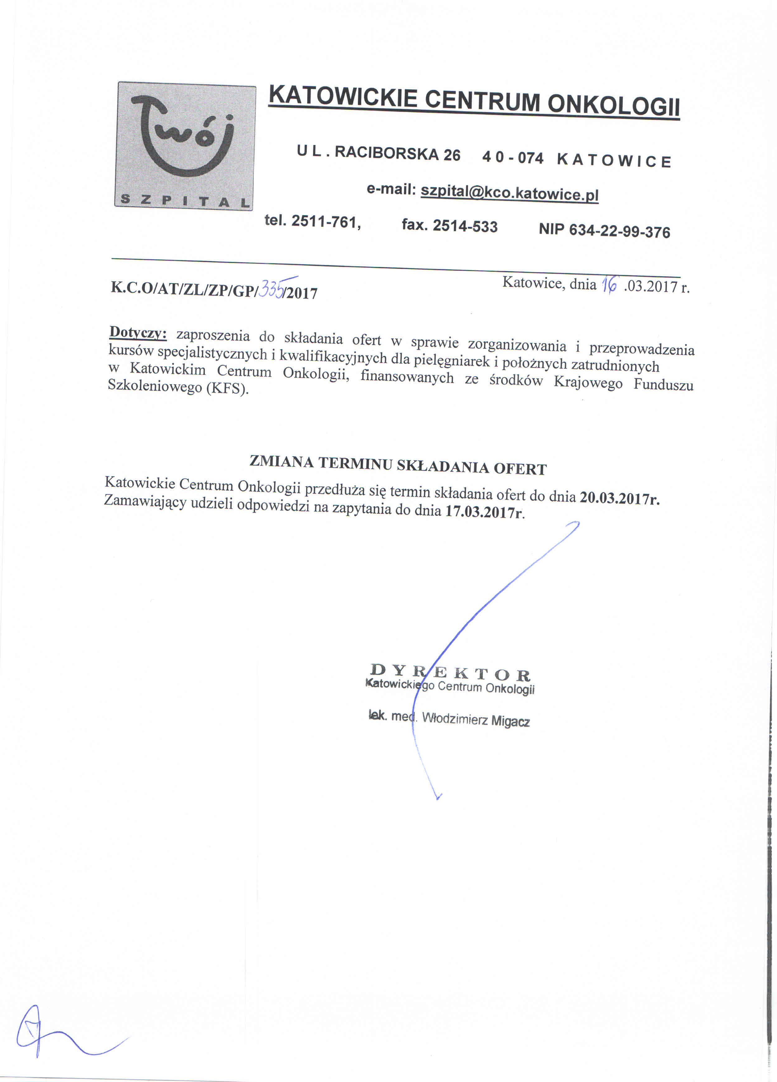 W związku z planowanym zorganizowaniem kursów finansowanych ze środków Krajowego Funduszu Szkoleniowego (KFS), Katowickie Centrum Onkologii zaprasza do składania ofert dotyczących zorganizowania i przeprowadzenia kursów specjalistycznych i kwalifikacyjnych dla pielęgniarek i położnych zatrudnionych w Katowickim Centrum Onkologii.