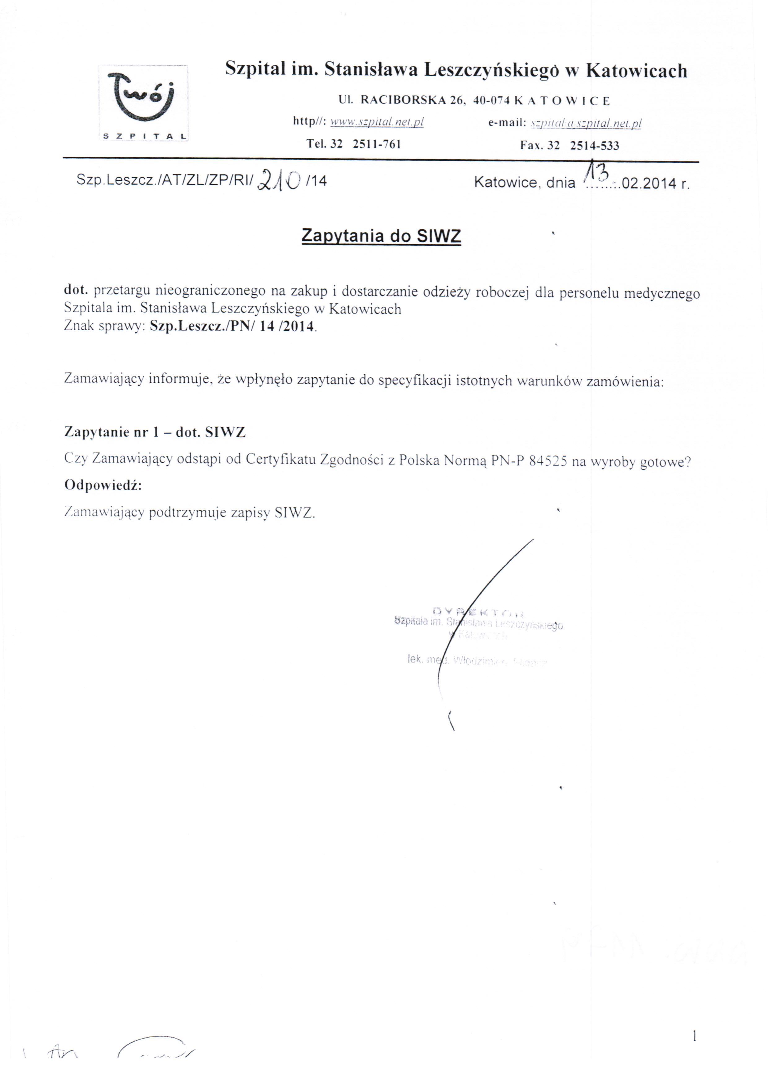 do dnia 18.02.2014 r. do godz. 10:00 w Szpitalu im. Stanisława Leszczyńskiego w Katowicach ul. Raciborska 26 – Kancelaria Dyrektora.
