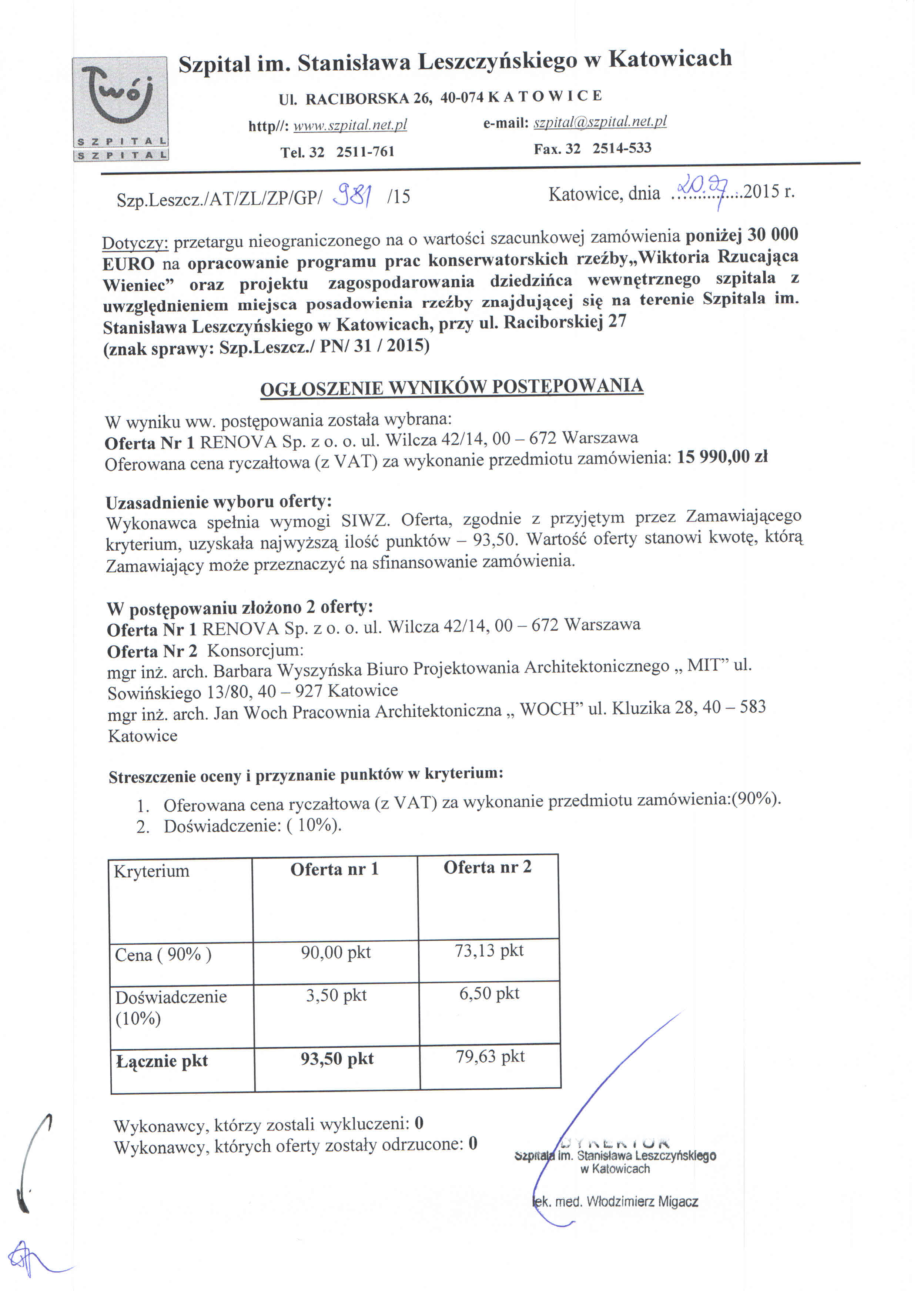 ogłasza przetarg nieograniczony o wartości szacunkowej zamówienia poniżej 30 000 EURO na opracowanie programu prac konserwatorskich rzeźby„Wiktoria Rzucająca Wieniec” oraz projektu zagospodarowania dziedzińca wewnętrznego szpitala z uwzględnieniem miejsca posadowienia rzeźby znajdującej się na terenie Szpitala im. Stanisława Leszczyńskiego w Katowicach, przy ul. Raciborskiej 27