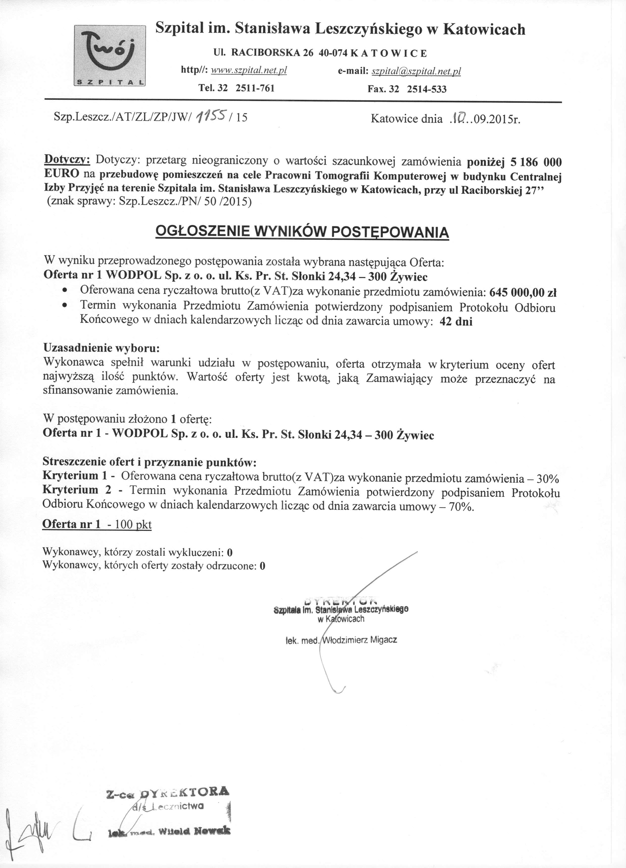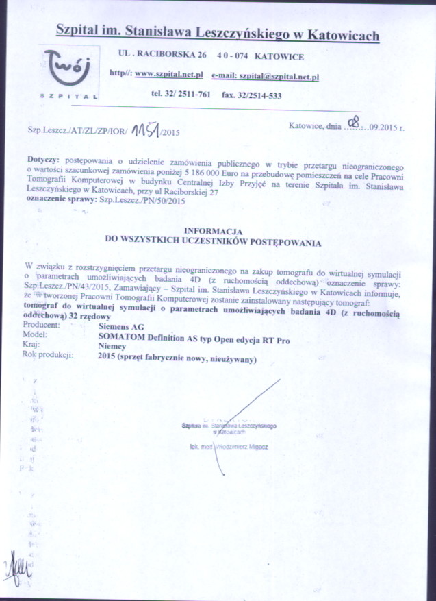 w dniu 09.09.2015r. o godz. 11:00 w Szpitalu im. Stanisława Leszczyńskiego w Katowicach ul. Raciborska 28, budynek Przychodni, II piętro, Sekcja Zamówień Publicznych.