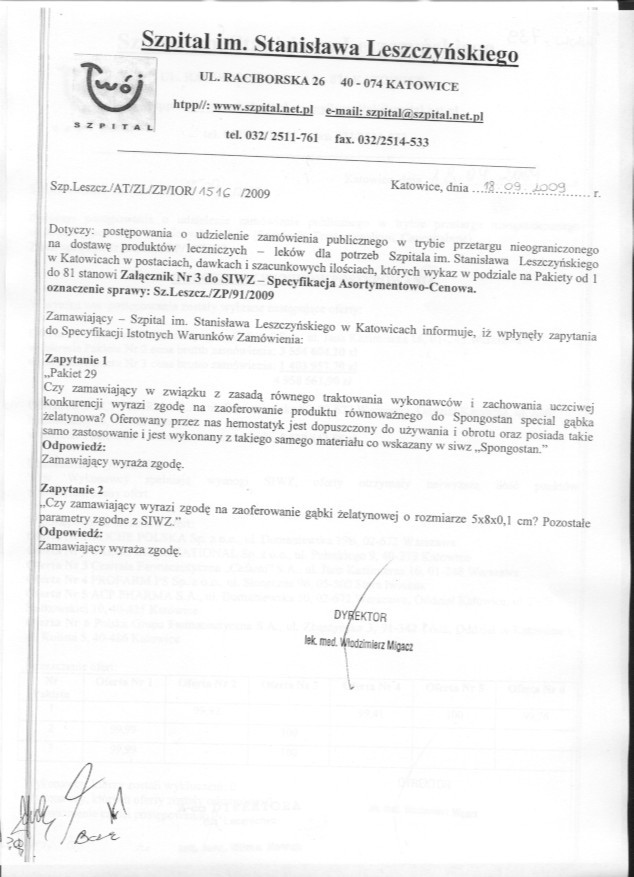 Oferty należy złożyć do dnia 14.10.2009r. do godz. 11:00 w Kancelarii Dyrektora Szpitala w Katowicach przy ul. Raciborskiej 26.