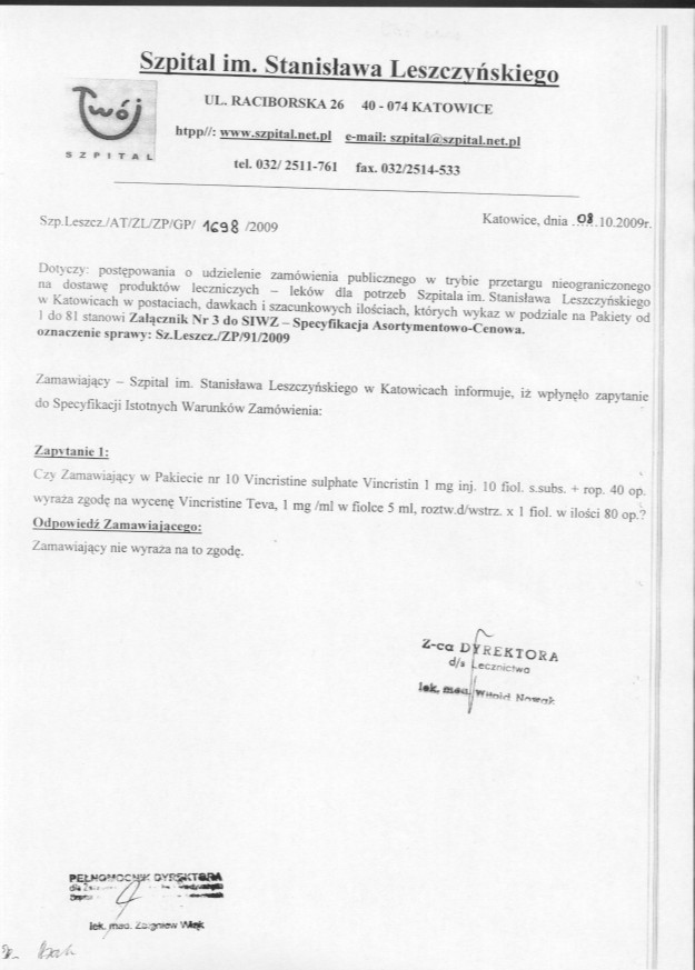 Otwarcie ofert nastąpi w dniu 14.10.2009r. o godz. 12:00 w Sali Konferencyjnej w Zakładzie Radioterapii w Katowicach przy ul. Raciborskiej 27.