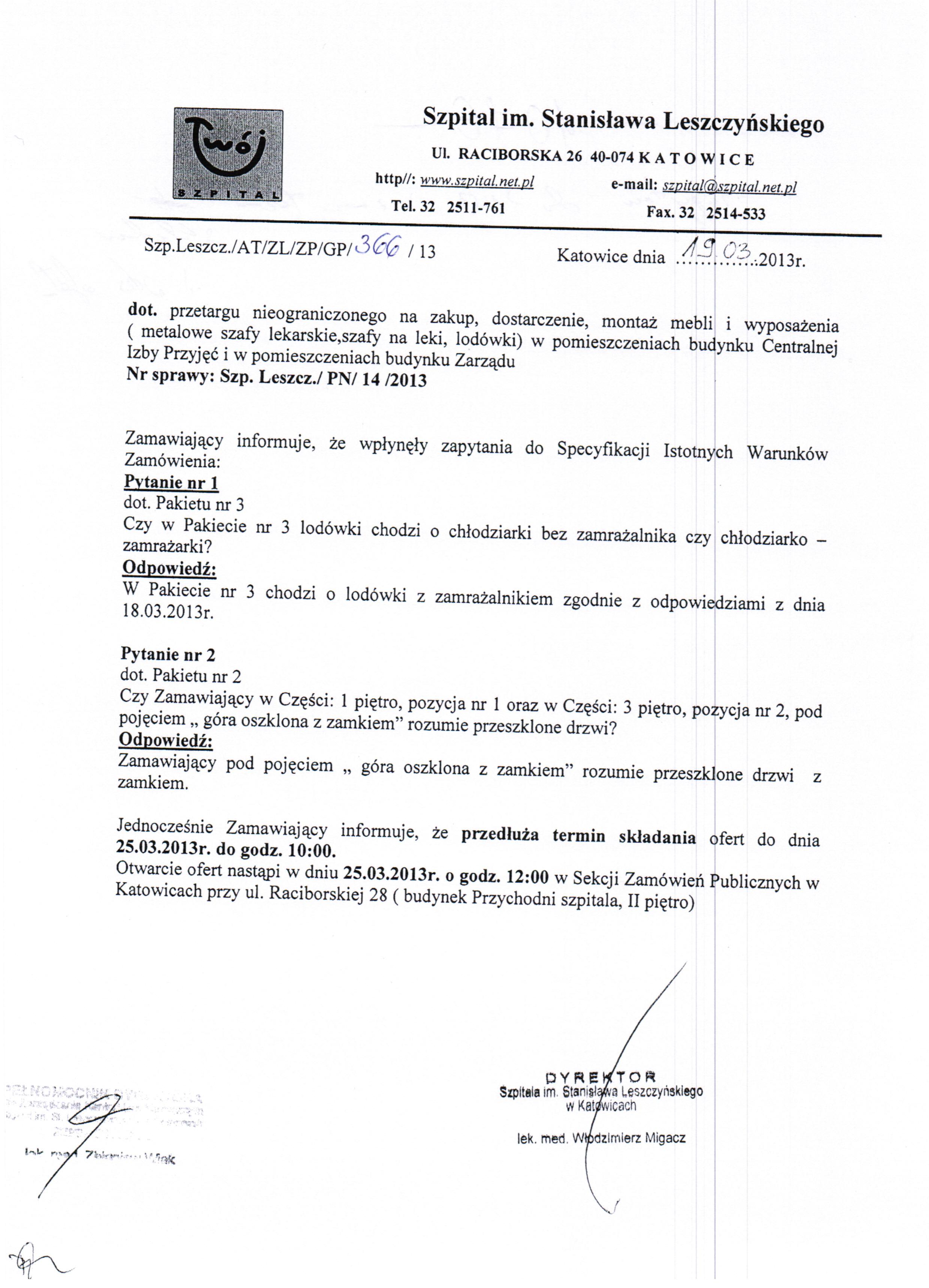 Otwarcie ofert nastąpi w dniu 21.03.2013r. o godz. 11:00 w Sekcji Zamówień Publicznych w Katowicach przy ul. Raciborskiej 28 (budynek Przychodni szpitala, II piętro)