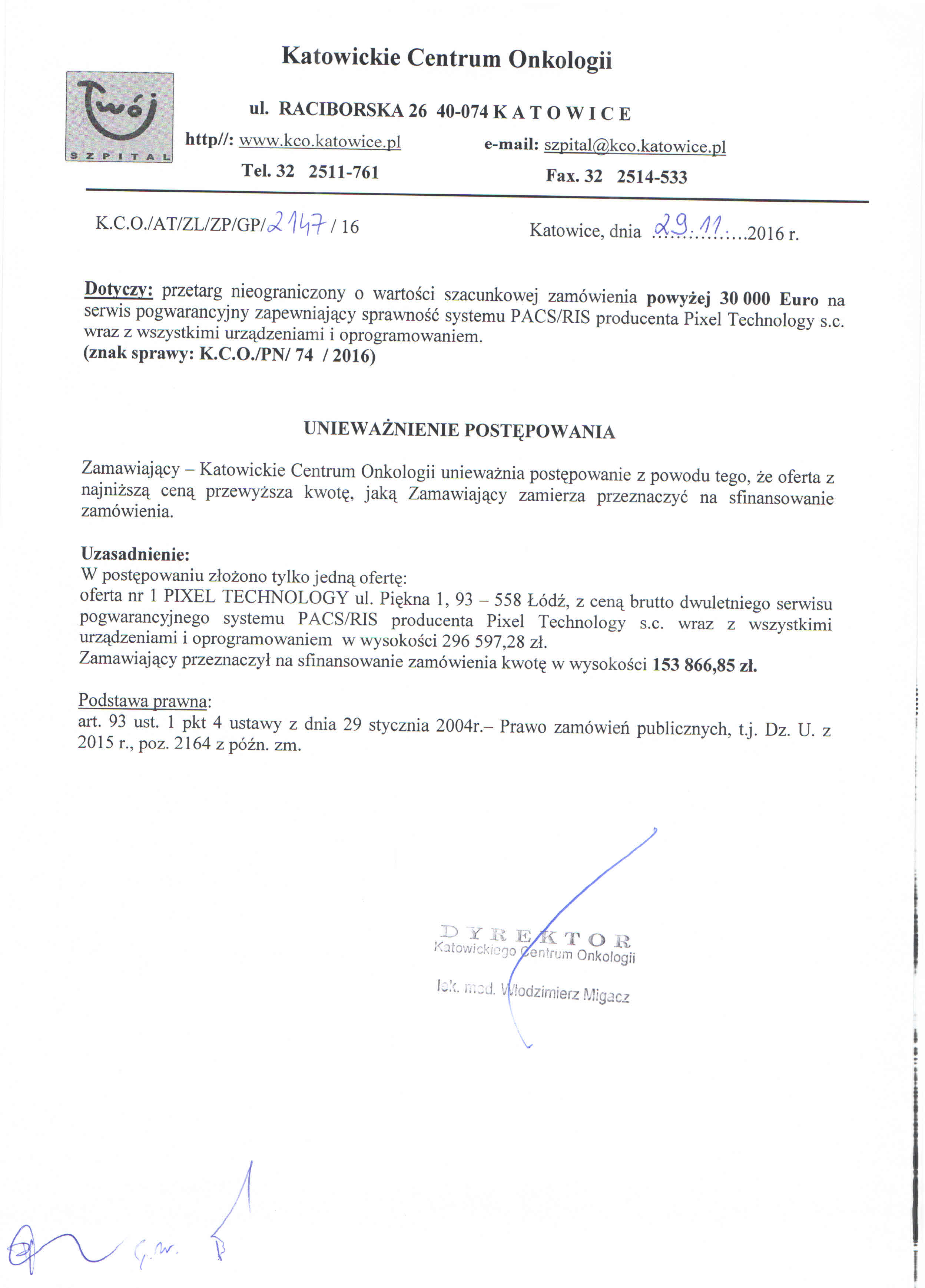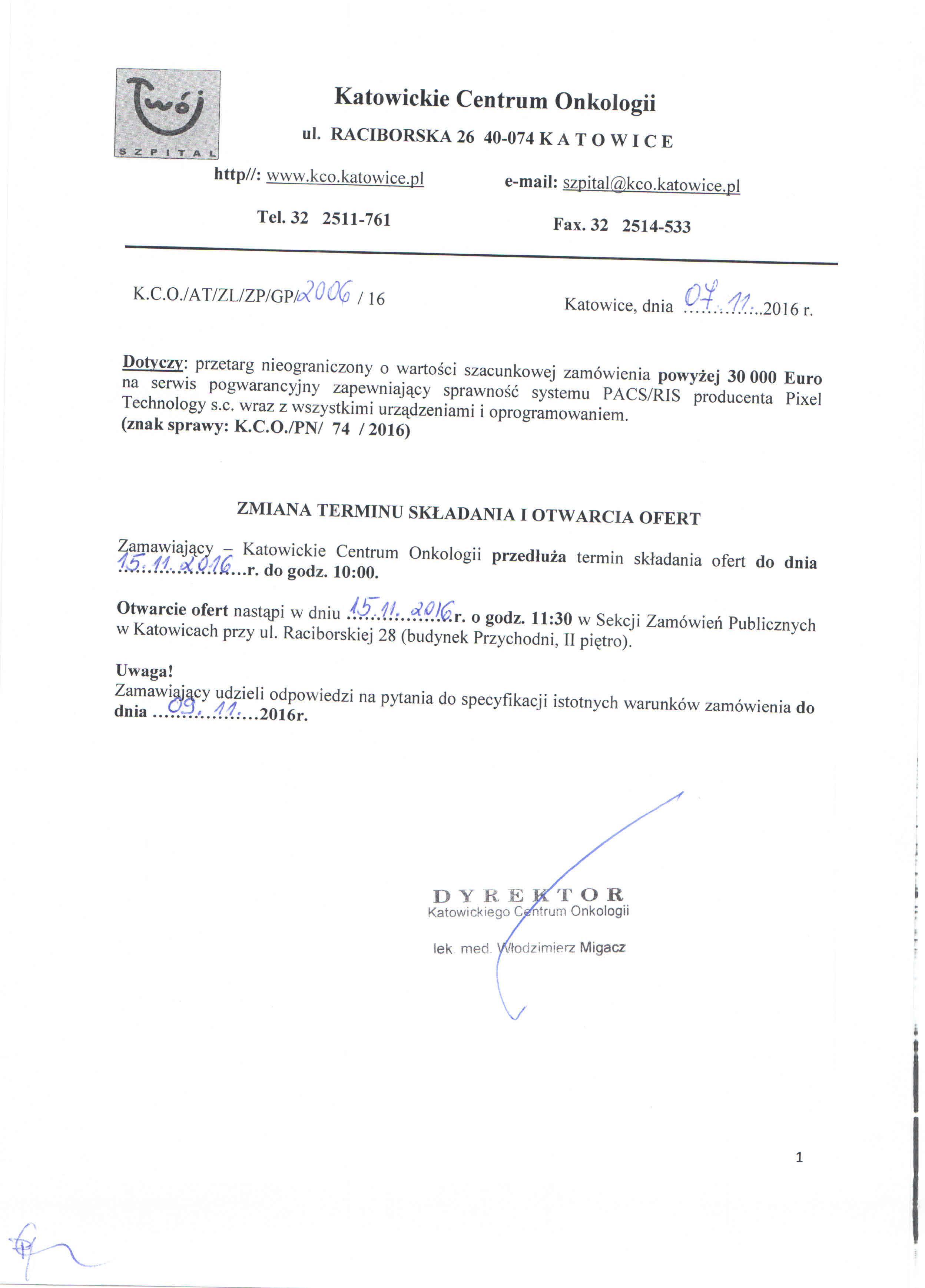 w dniu 08.11.2016r. o godz. 11:00, w 40-074 Katowice, ul. Raciborska 28 (budynek Przychodni, II piętro, Sekcja Zamówień Publicznych)