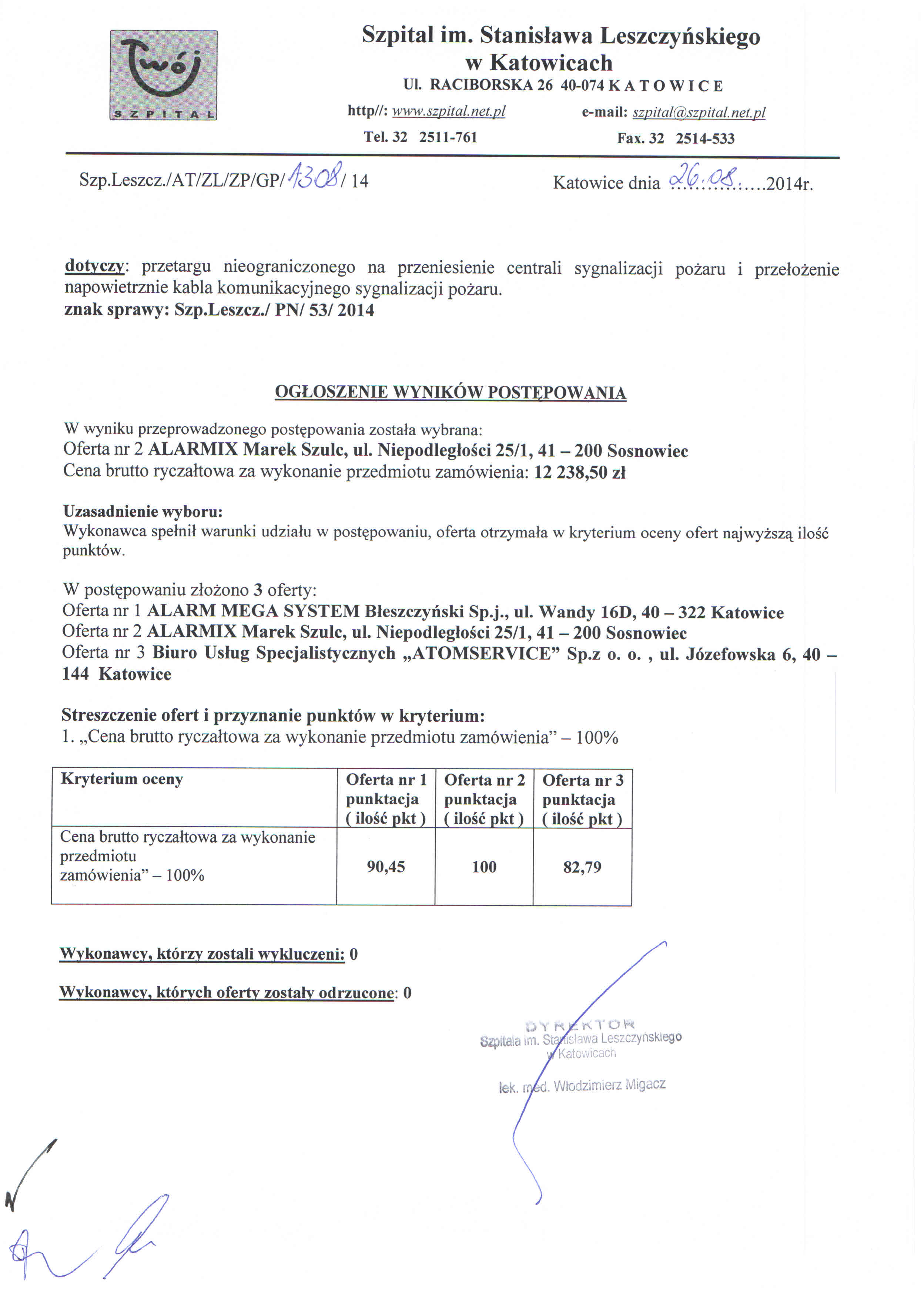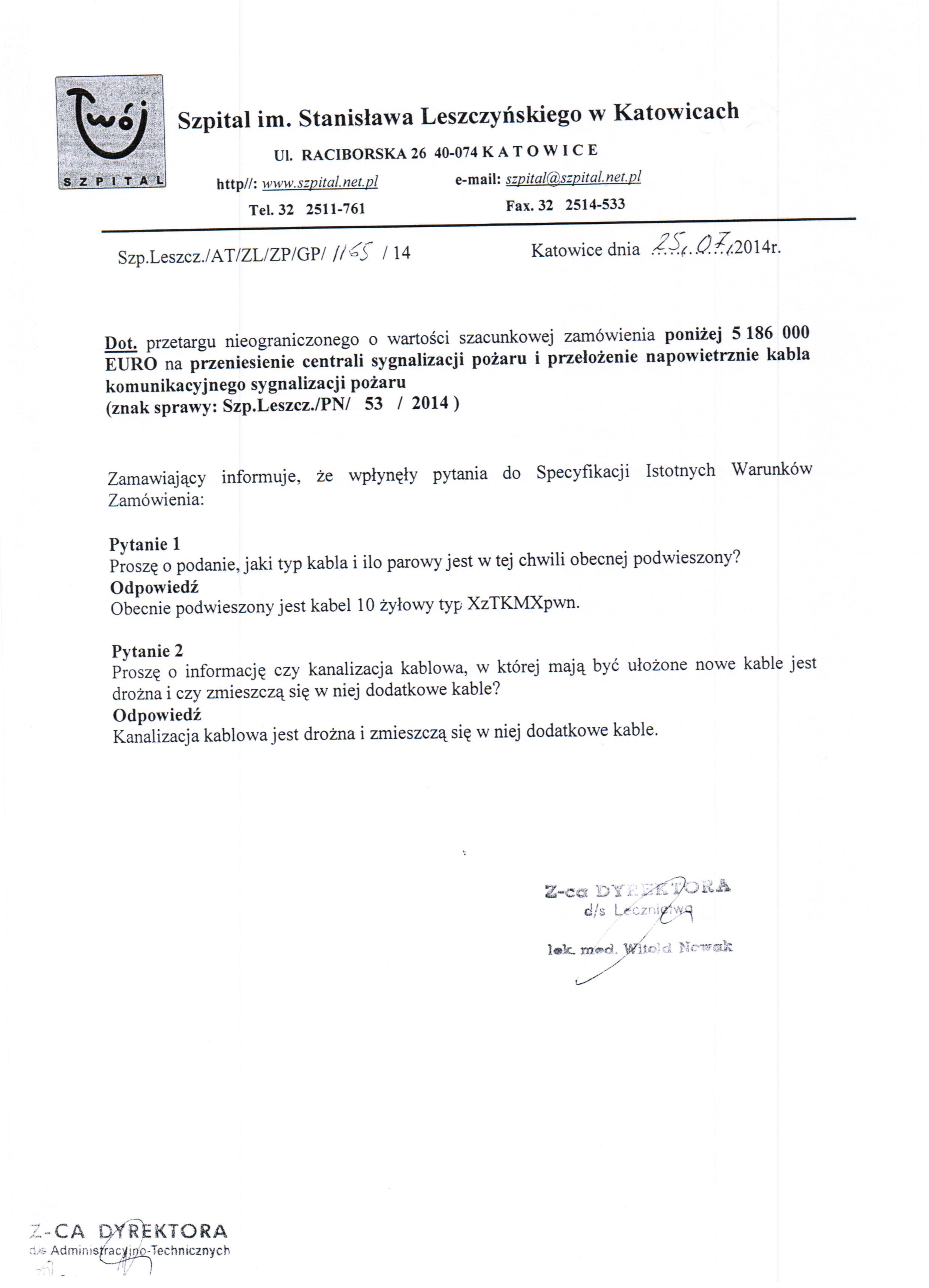 w dniu 04.08.2014r. o godz. 11:00 w Szpitalu im. Stanisława Leszczyńskiego w Katowicach ul. Raciborska 28, budynek Przychodni, II piętro, Sekcja Zamówień Publicznych.