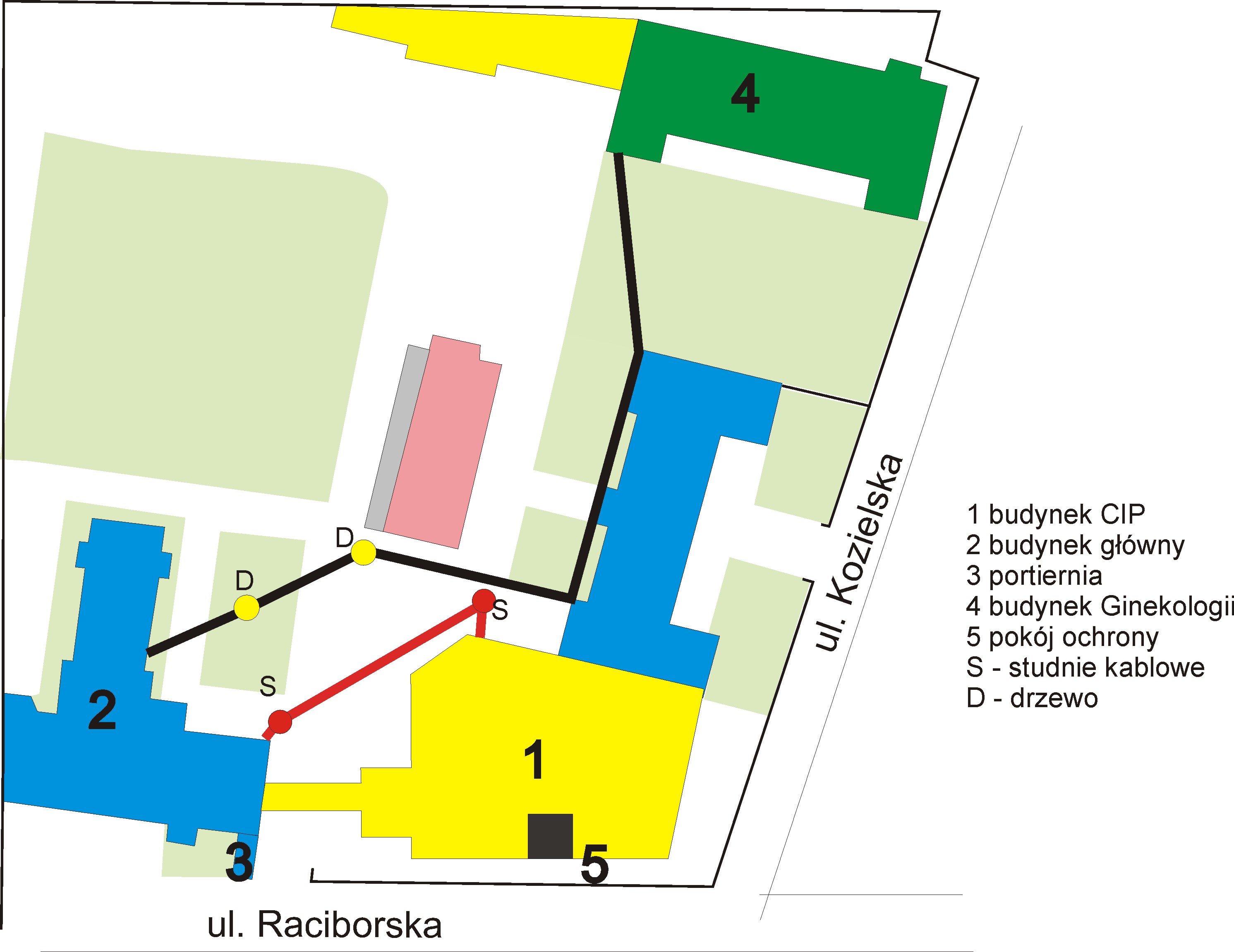 - Przełożenie napowietrznie kabla komunikacyjnego sygnalizacji pożaru w budynku gin.-poł. poprzez budynek główny do centrali pożarowej Polon Alfa 3800 zlokalizowanej w budynku CIP, po wykonaniu zadania określonego w pkt a);