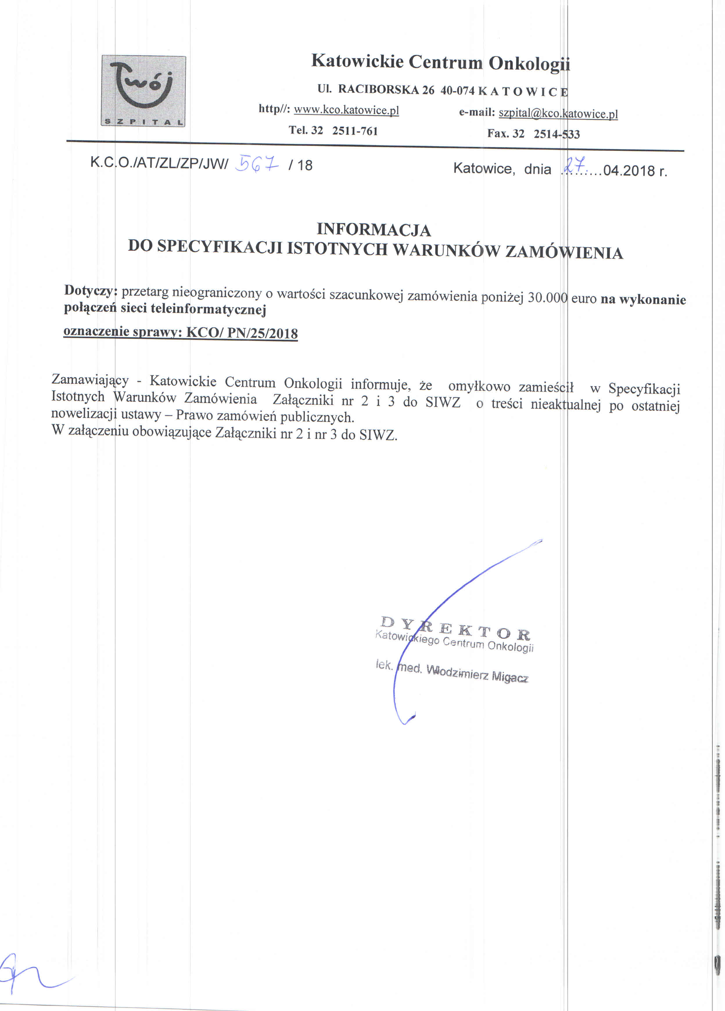 Specyfikacja Istotnych Warunków Zamówienia – zwana dalej SIWZ – jest dostępna na stronie internetowej Zamawiającego: www.kco.katowice.pl
