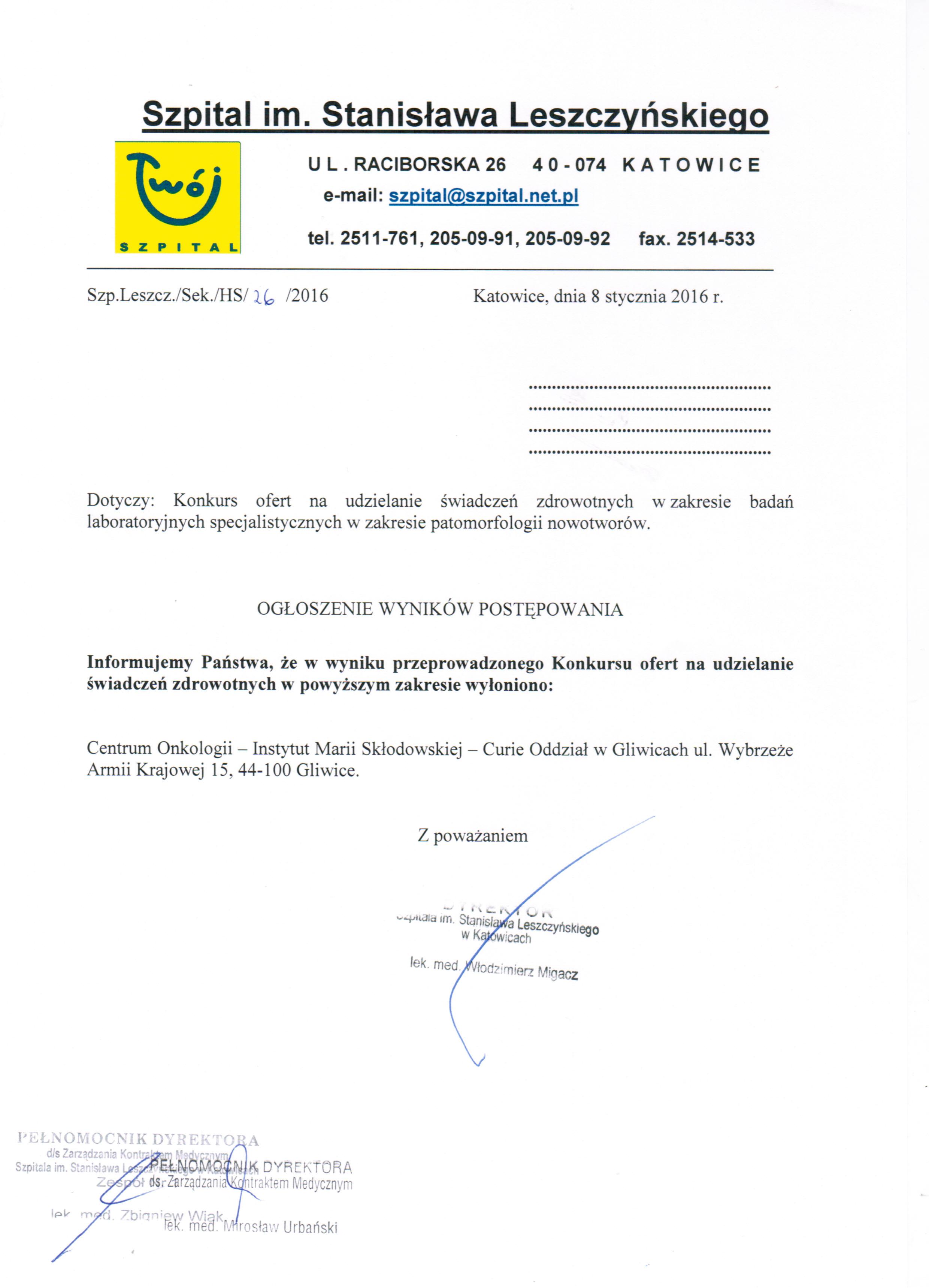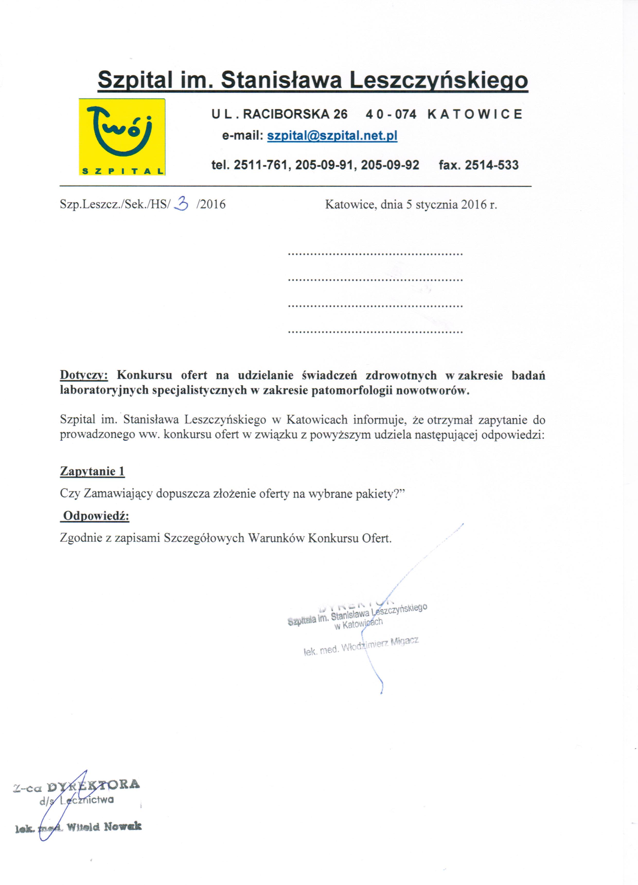1. Szpital im. Stanisława Leszczyńskiego w Katowicach ul. Raciborska 26 zwany dalej Udzielającym Zamówienia ogłasza zamówienie na udzielanie świadczeń zdrowotnych w zakresie badań laboratoryjnych specjalistycznych w zakresie patomorfologii nowotworów.
