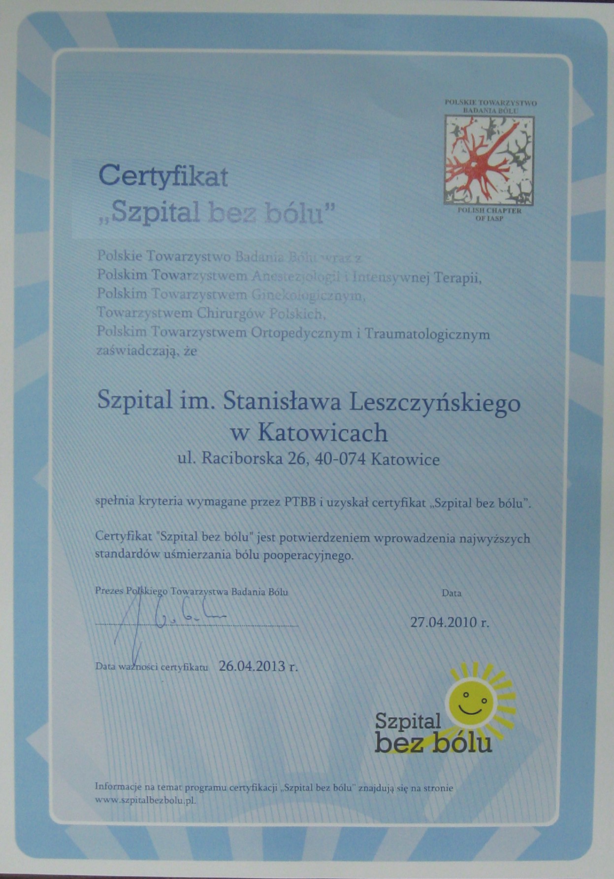 Polskie Towarzystwo Badania Bólu wraz z Polskim Towarzystwem Anestezjologii i Intensywnej Terapii, Polskim Towarzystwem Ginekologicznym, Towarzystwem Chirurgów Polskich, Polskim Towarzystwem Ortopedycznym i Traumatologicznym zaświadczają, że Szpital im. Stanisława Leszczyńskiego w Katowicach spełnia kryteria wymagane przez PTBB i uzyskał certyfikat "Szpital bez bólu", potwierdzający wprowadzenie najwyższych standardów uśmierzania bólu pooperacyjnego.