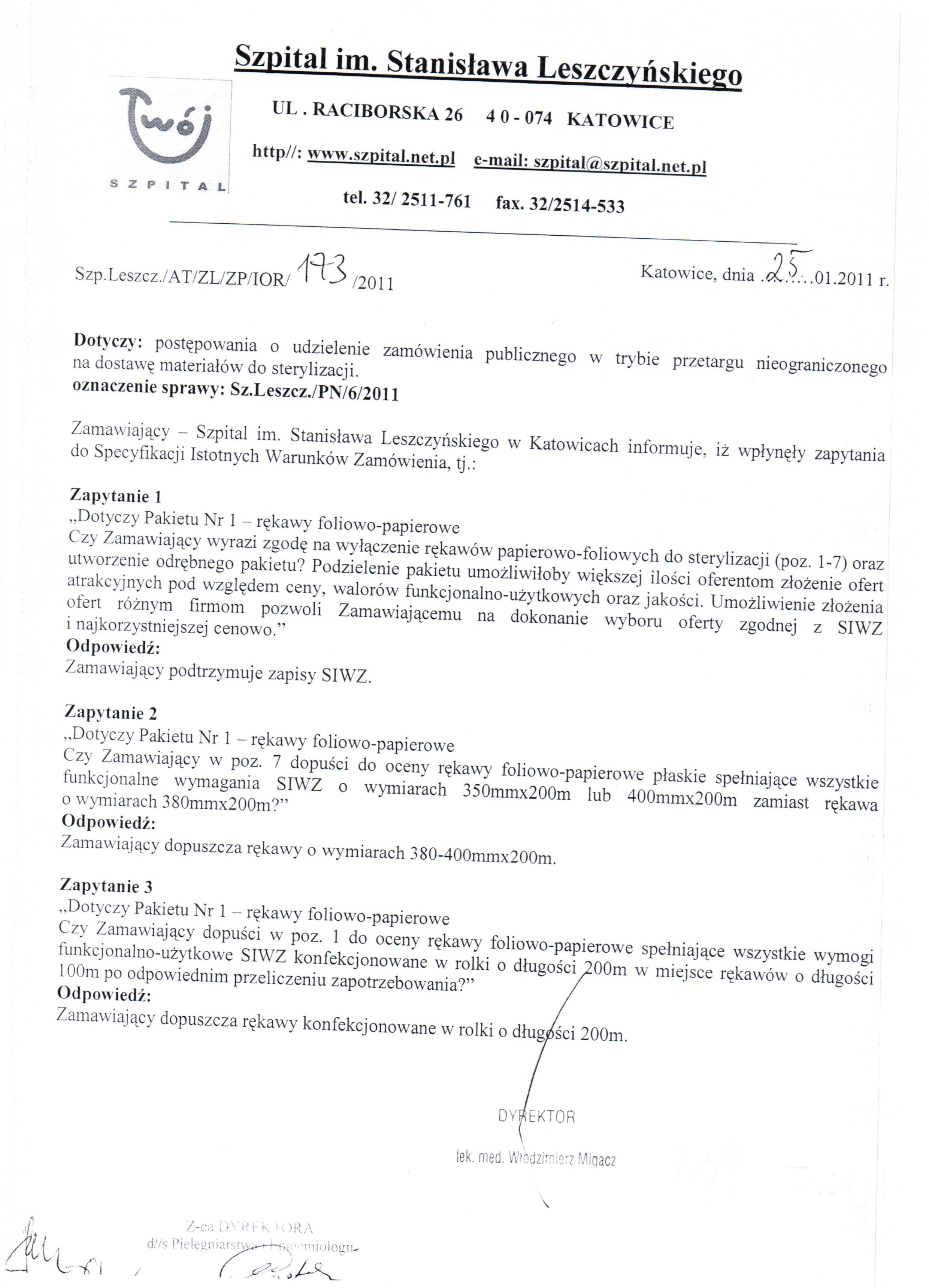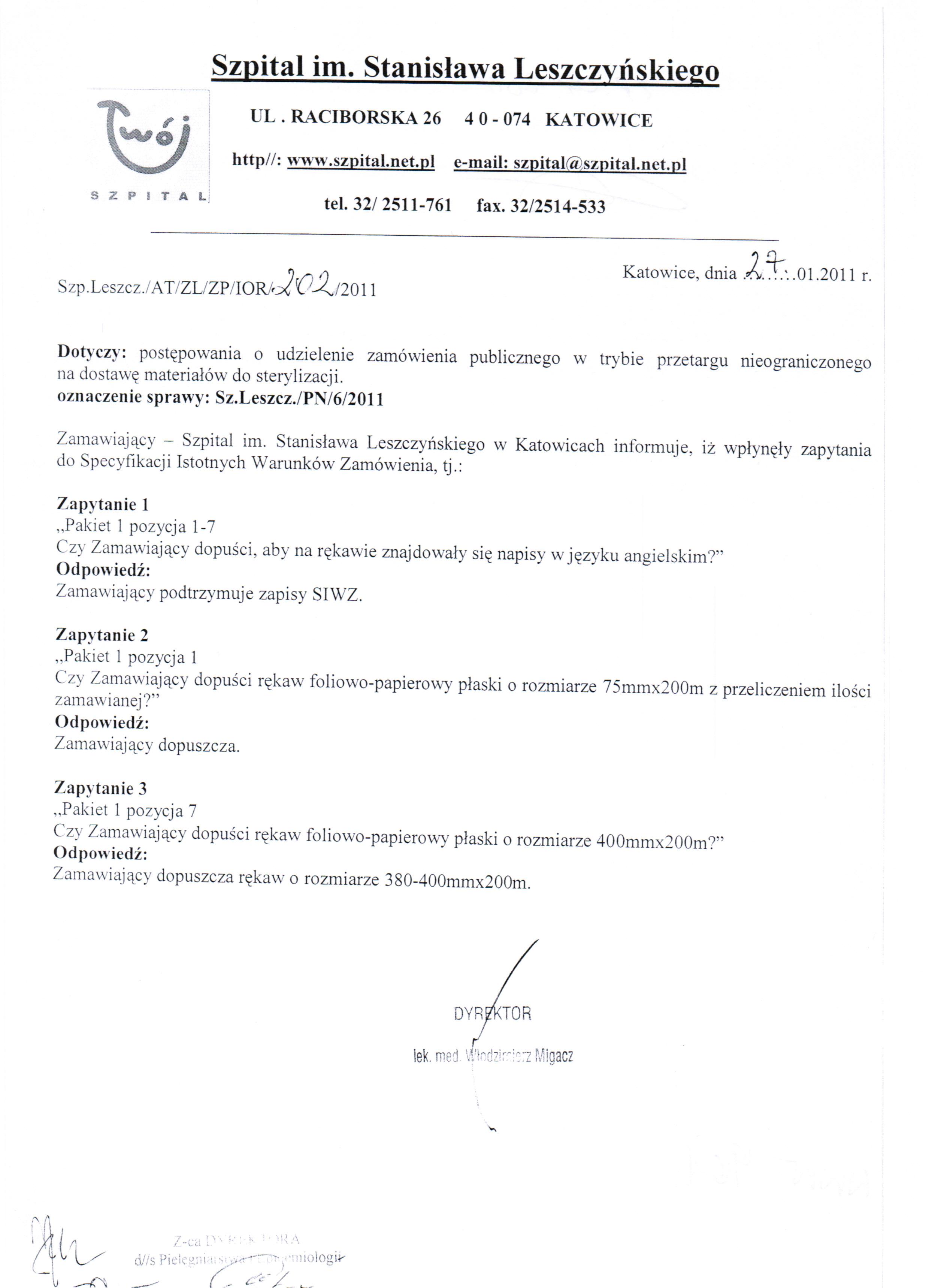 w dniu 01.02.2011r. o godz. 11:00 w 40-074 Katowice, ulica Raciborska 28, budynek Przychodni, II piętro, Sekcja Zamówień Publicznych.