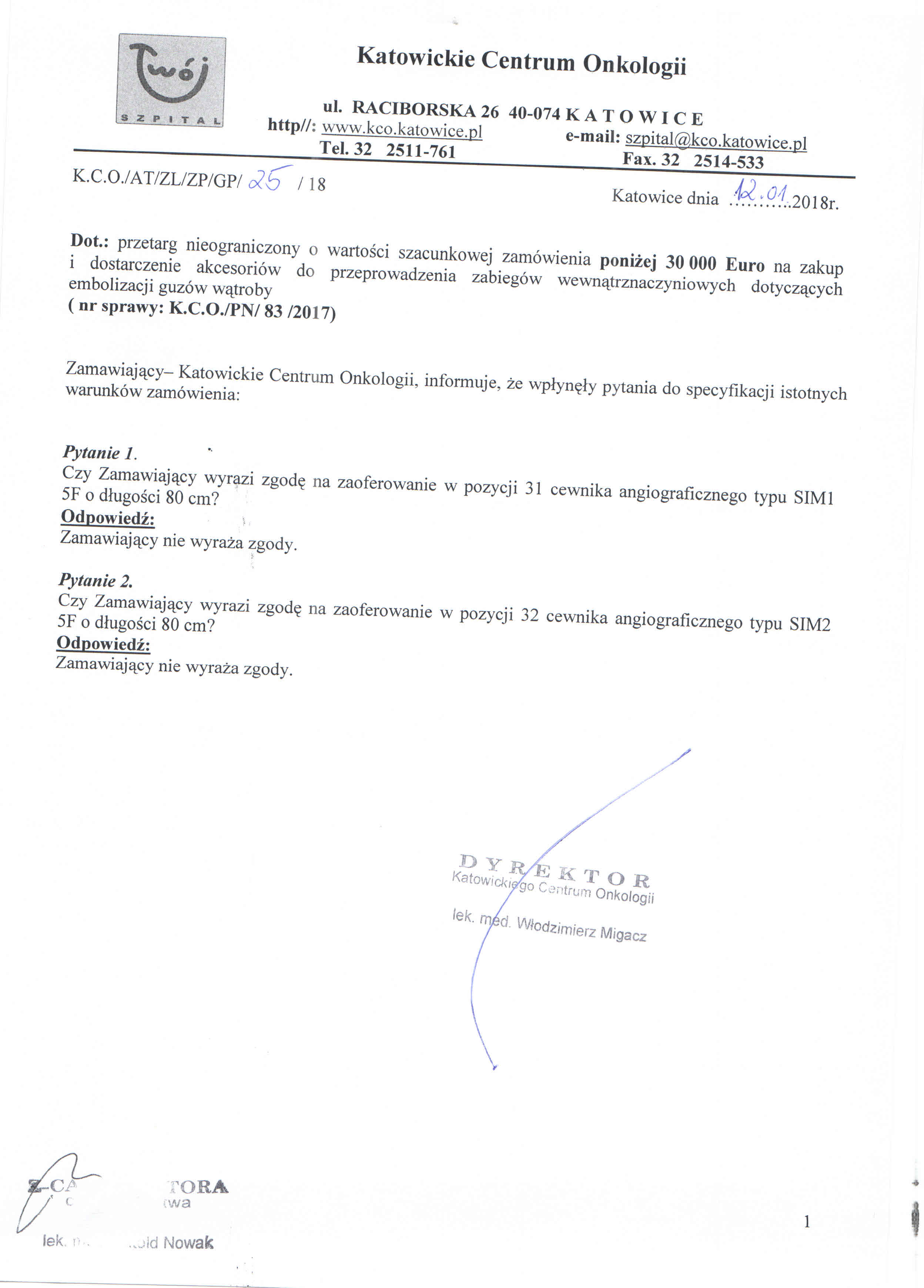w dniu 18.01.2018r. o godz. 11:00 w Katowickim Centrum Onkologii ul. Raciborska 28, budynek Przychodni, II piętro, Sekcja Zamówień Publicznych.