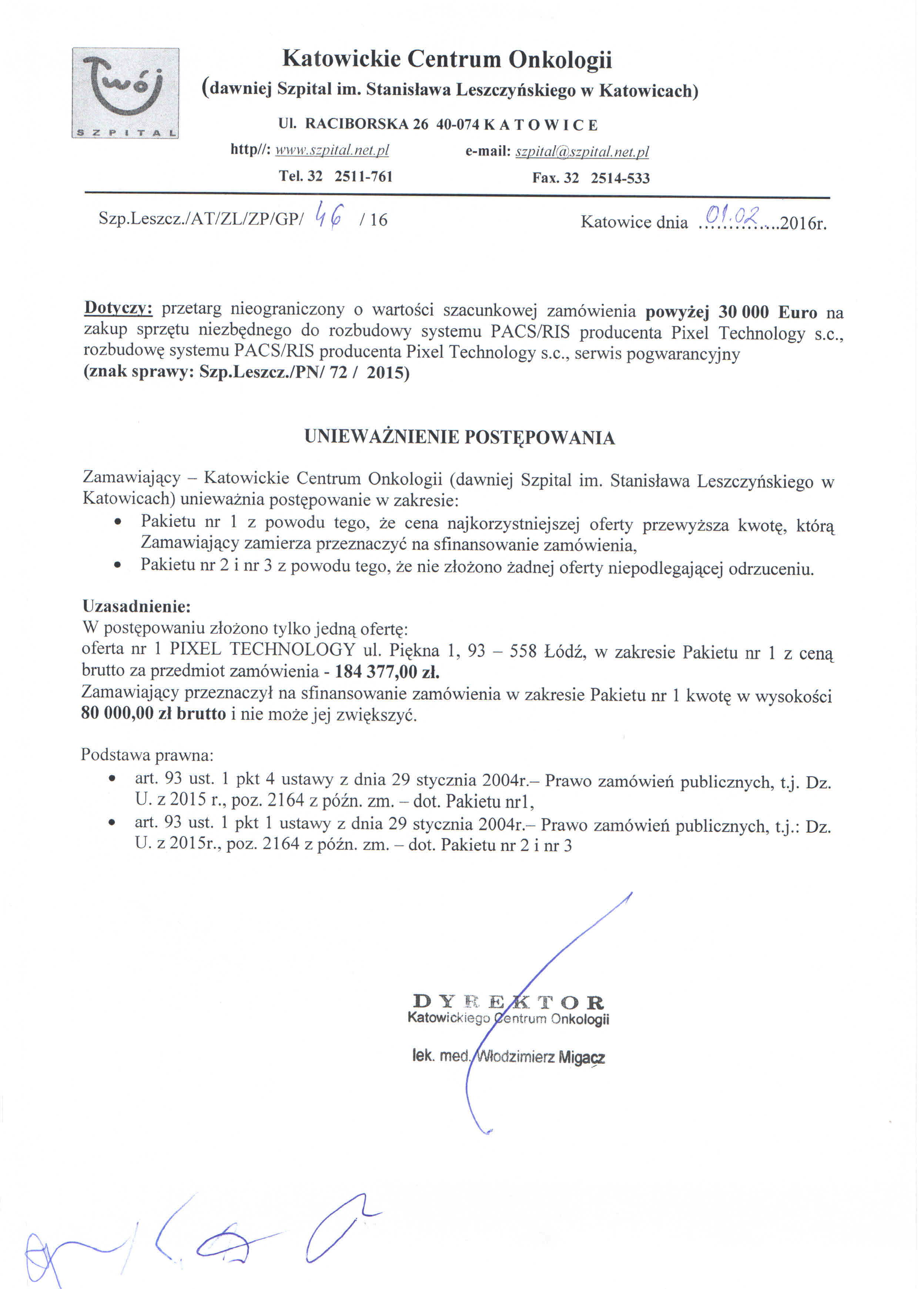 ogłasza przetarg nieograniczony o wartości szacunkowej zamówienia powyżej 30 000 Euro na zakup sprzętu niezbędnego do rozbudowy systemu PACS/RIS producenta Pixel Technology s.c., rozbudowę systemu PACS/RIS producenta Pixel Technology s.c., serwis pogwarancyjny