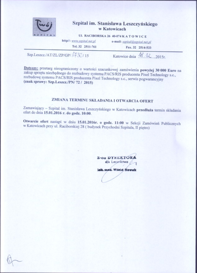 do dnia 29.12.2015r. do godz. 10:00 w Szpitalu im. Stanisława Leszczyńskiego w Katowicach ul. Raciborska 26 – Kancelaria Dyrektora, I piętro.