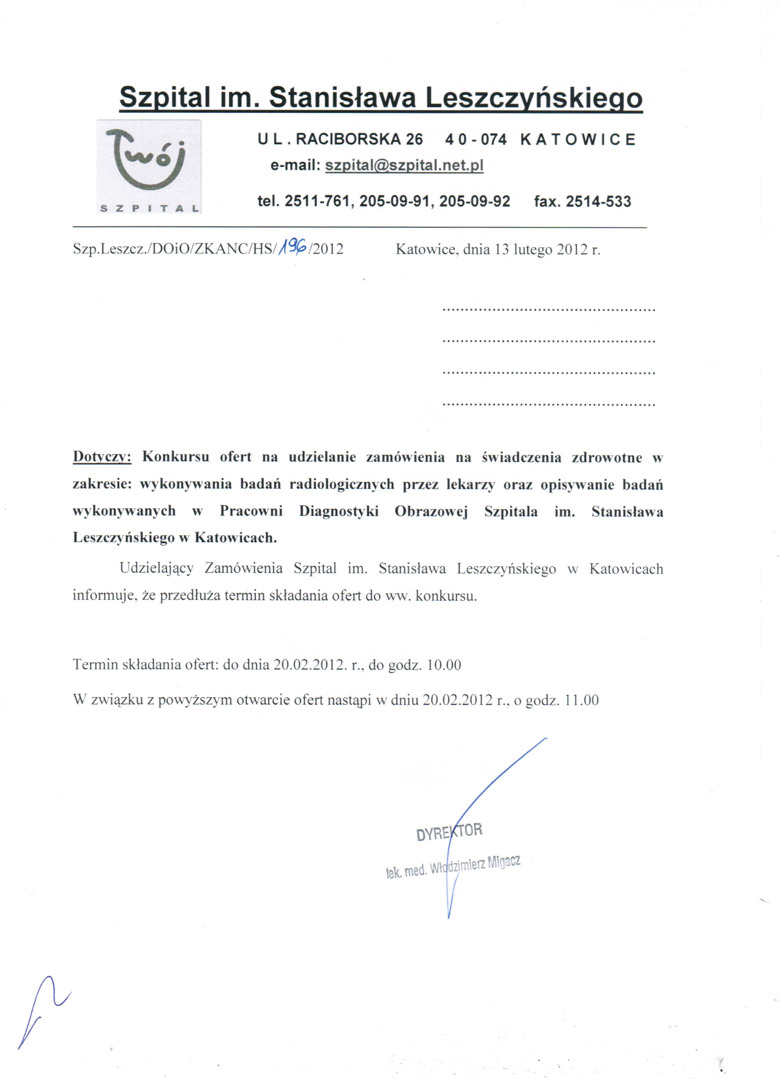- Oferty należy składać w Kancelarii Szpitala im. Stanisława Leszczyńskiego w Katowicach ul. Raciborska 26 do dnia 14.02.2012 r. do godz. 10.00.