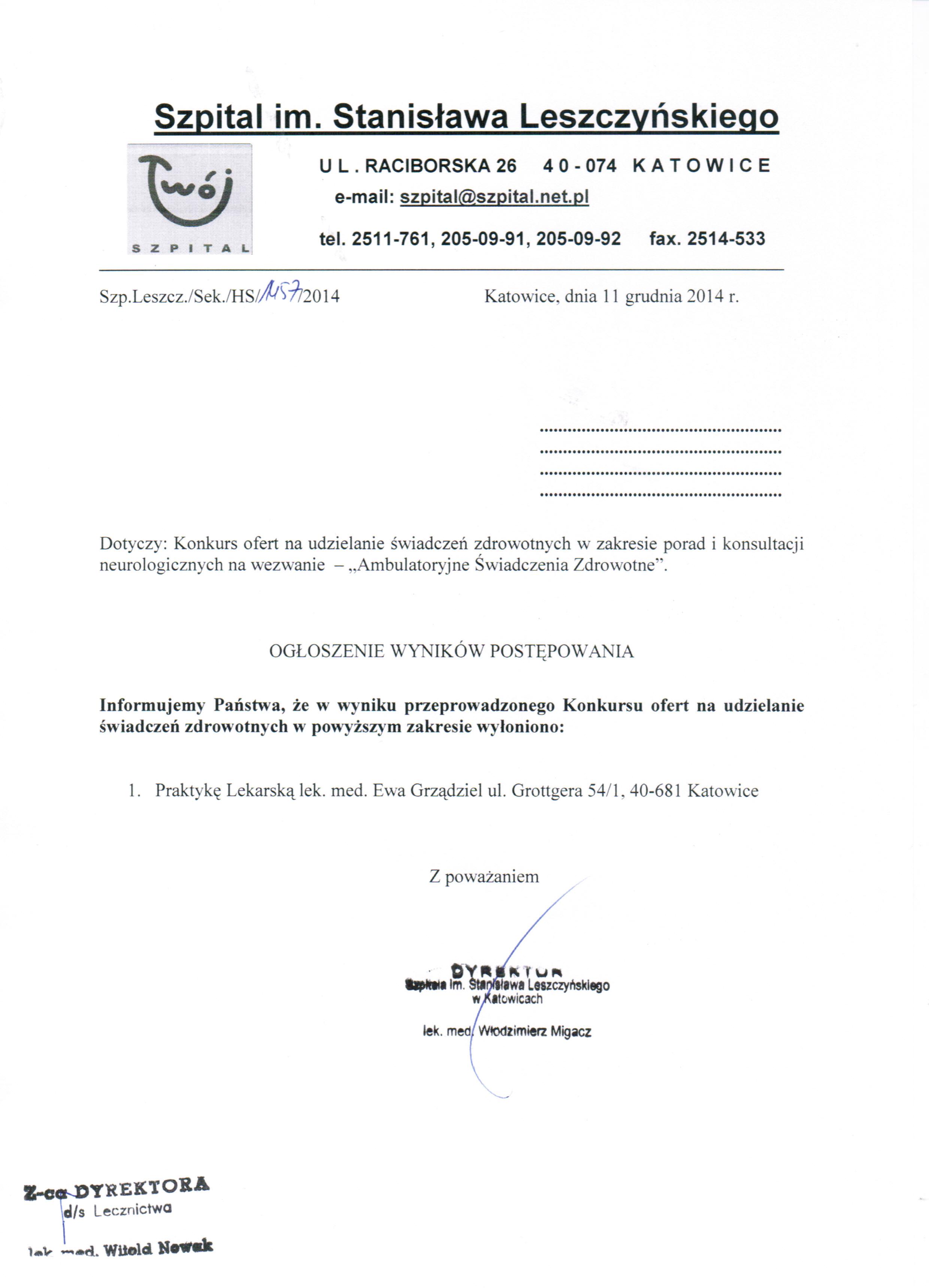 Dodatkowych informacji udziela Z-ca Dyrektora ds. Lecznictwa lek. med. Witold Nowak pod nr tel. (32) 251 17 61.