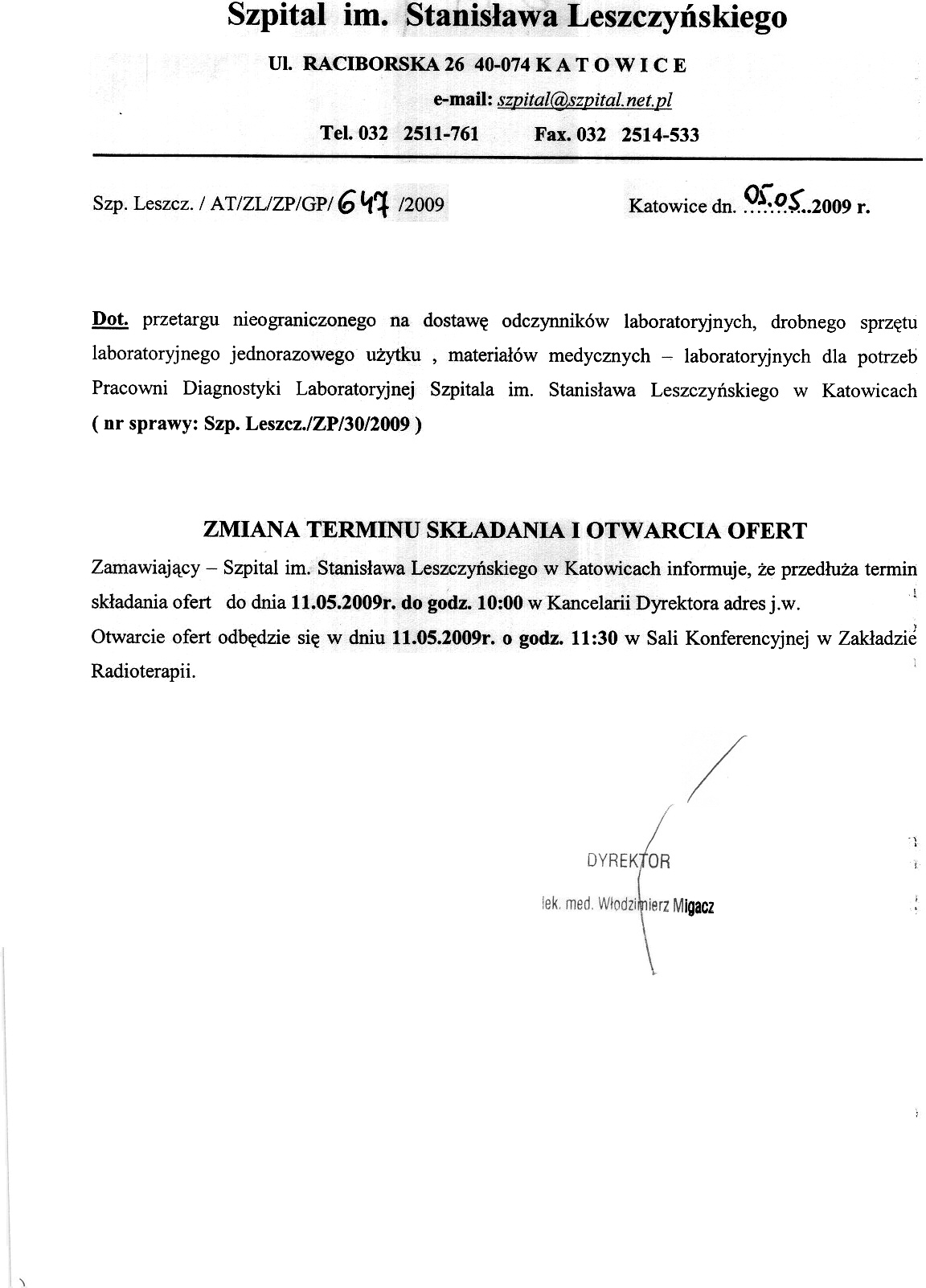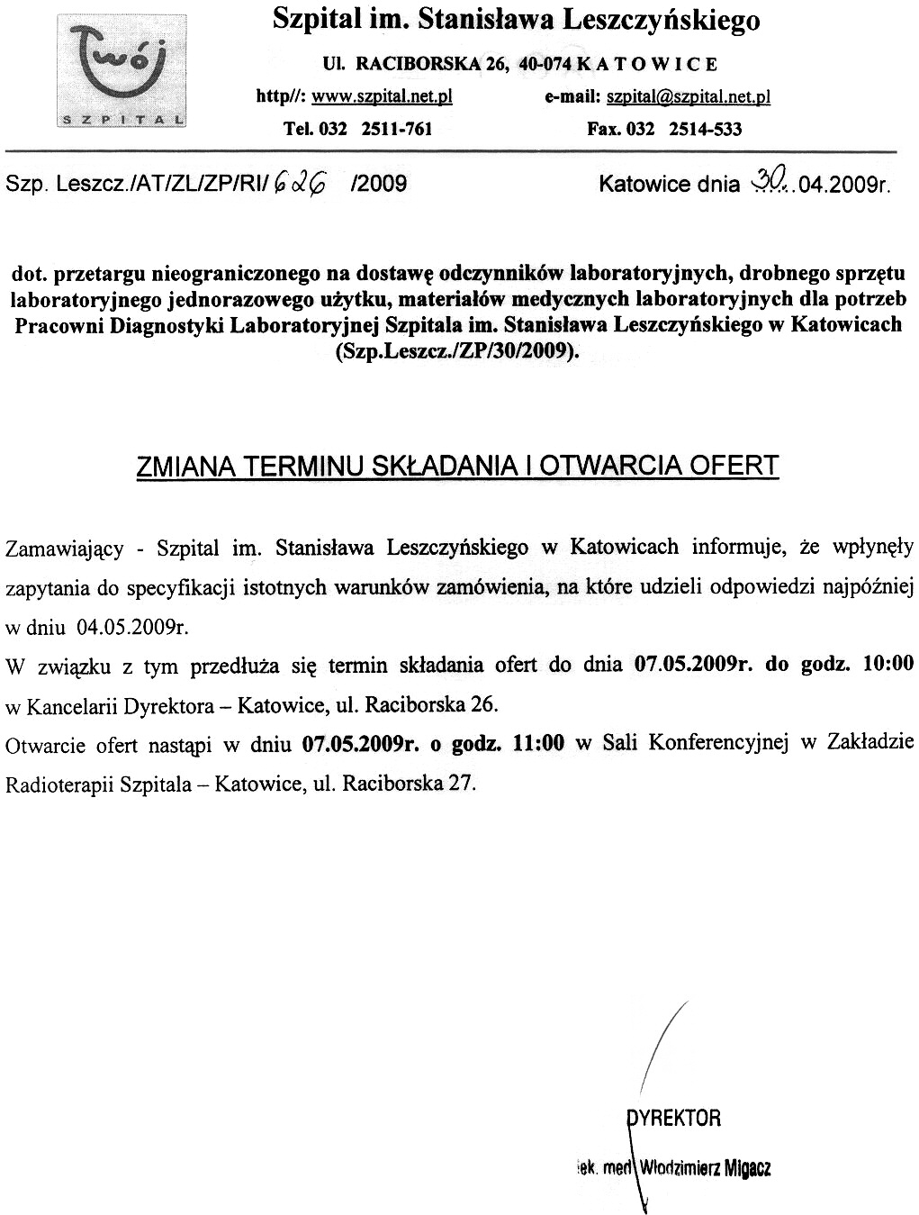 do dnia 05.05.2009r. do godz. 10:00 w Kancelarii Dyrektora Szpitala im. Stanisława Leszczyńskiego w Katowicach, przy ul. Raciborskiej 26.