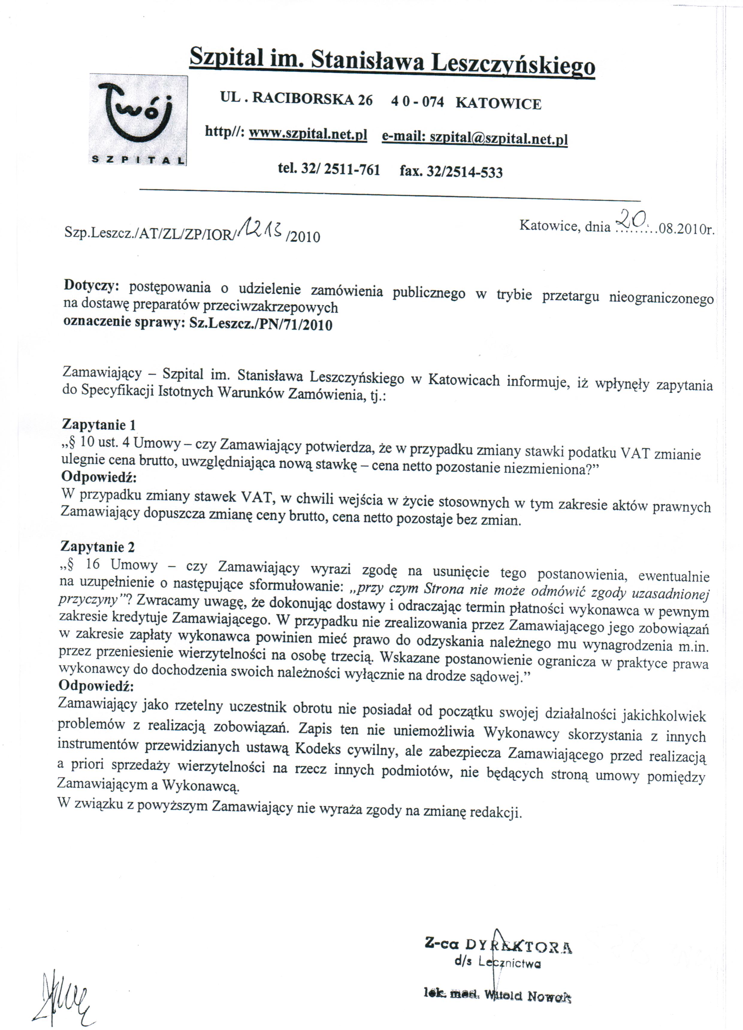 Otwarcie ofert nastąpi w dniu 25.08.2010r. o godz. 11:00 w Budynku Przychodni Szpitala w Katowicach przy ul. Raciborskiej 28 (II piętro).