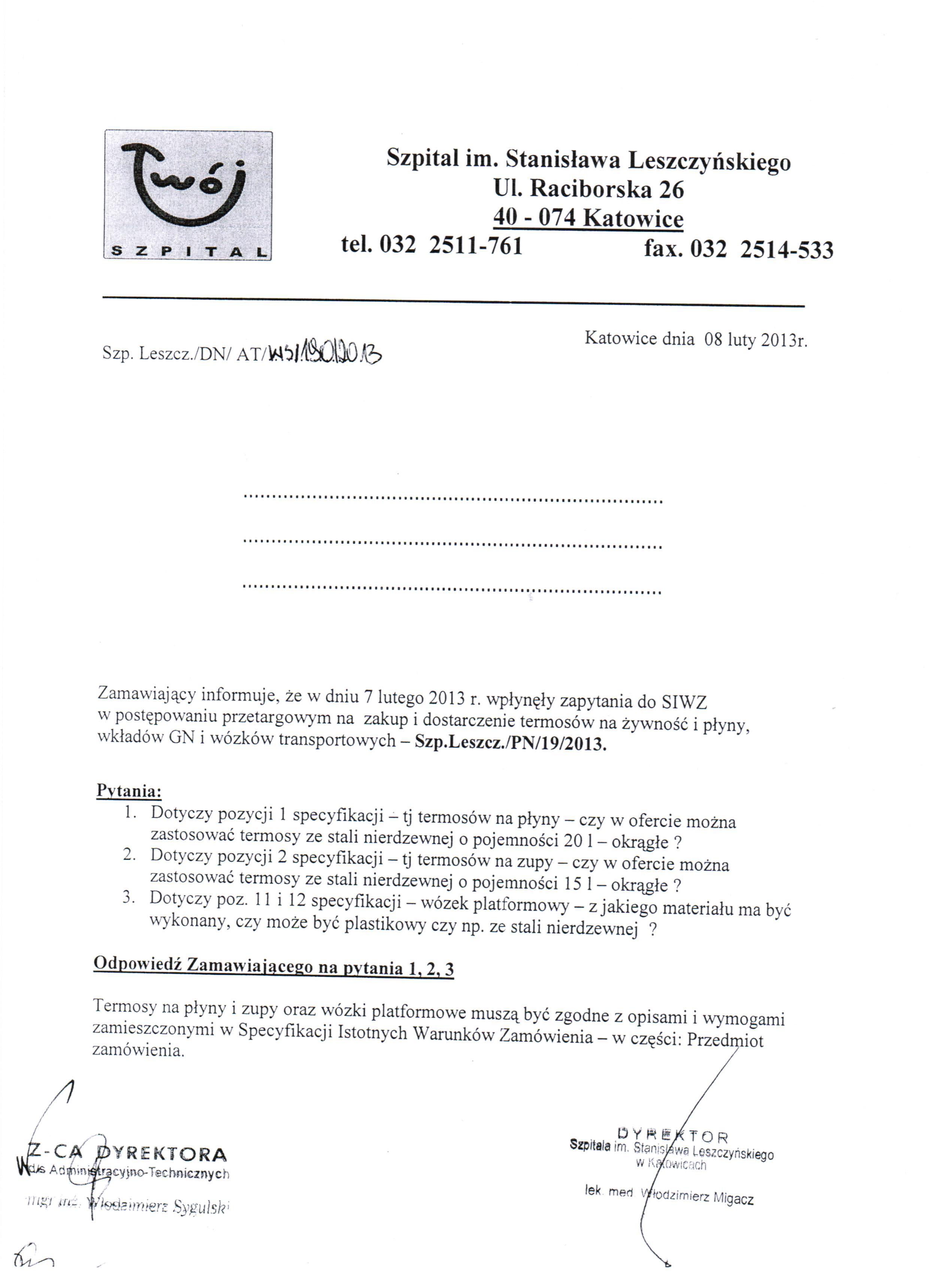 Oferty należy złożyć do dnia 15.02.2013r. do godz. 10:00 w Kancelarii Dyrektora Szpitala w Katowicach przy ul. Raciborskiej 26.