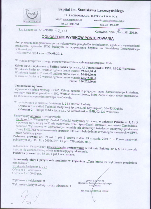 Otwarcie ofert nastąpi w dniu 11.12.2012r. o godz. 11:00 w Szpitalu im. Stanisława Leszczyńskiego w Katowicach ul. Raciborska 28, budynek Przychodni, II piętro, Sekcja Zamówień Publicznych.