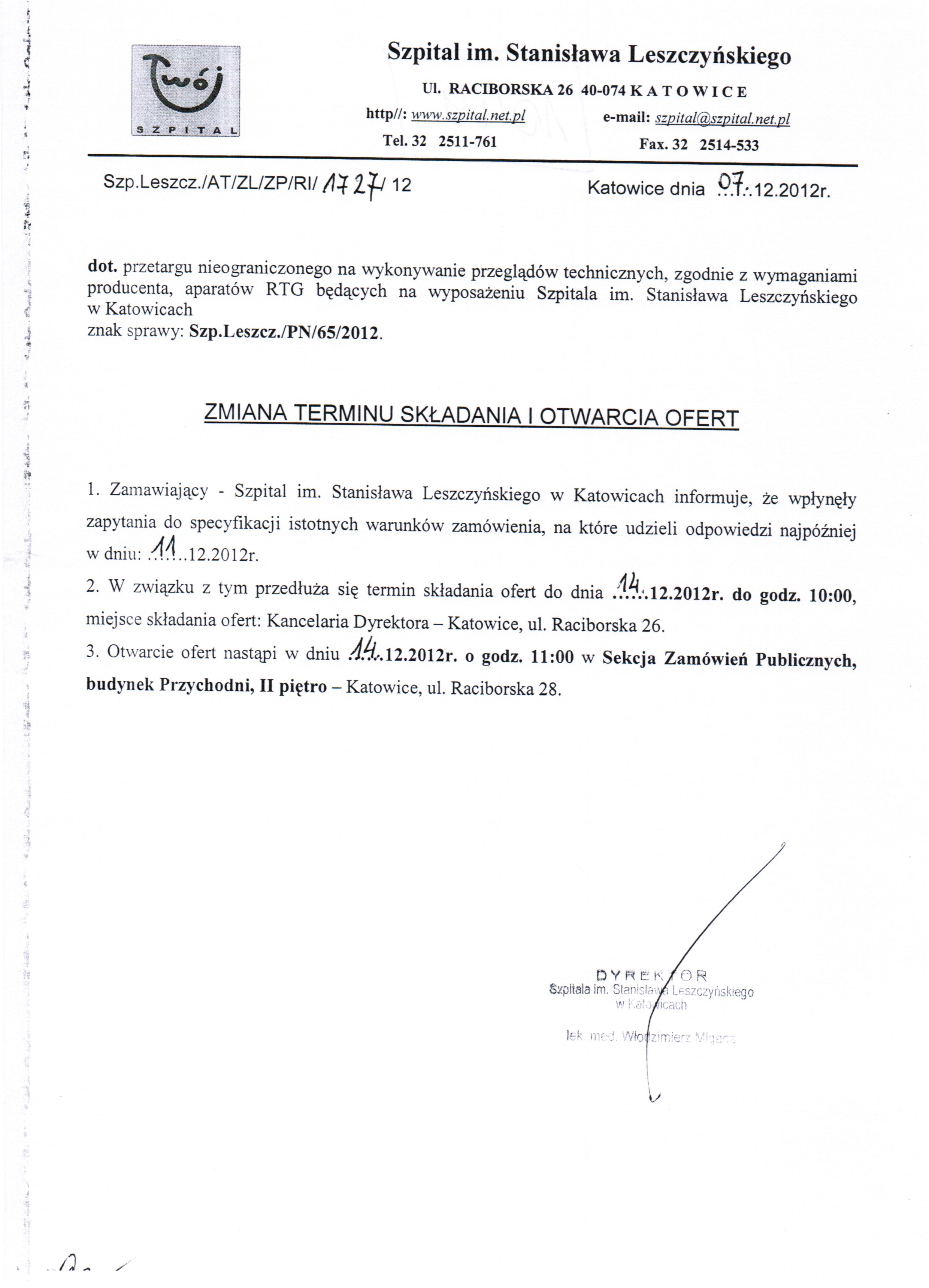 Oferty należy złożyć do dnia 11.12.2012r. do godz. 10:00 w Szpitalu im. Stanisława Leszczyńskiego w Katowicach ul. Raciborska 26 – Kancelaria Dyrektora.
