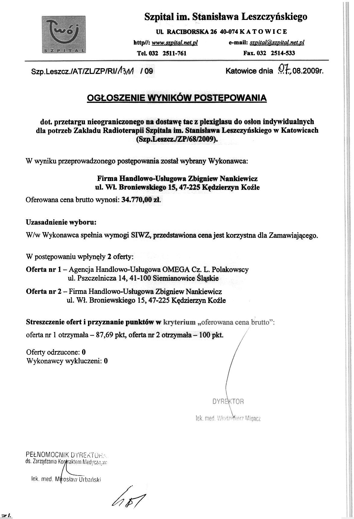 Ogłoszenie wyników postępowania - 07.08.2009r