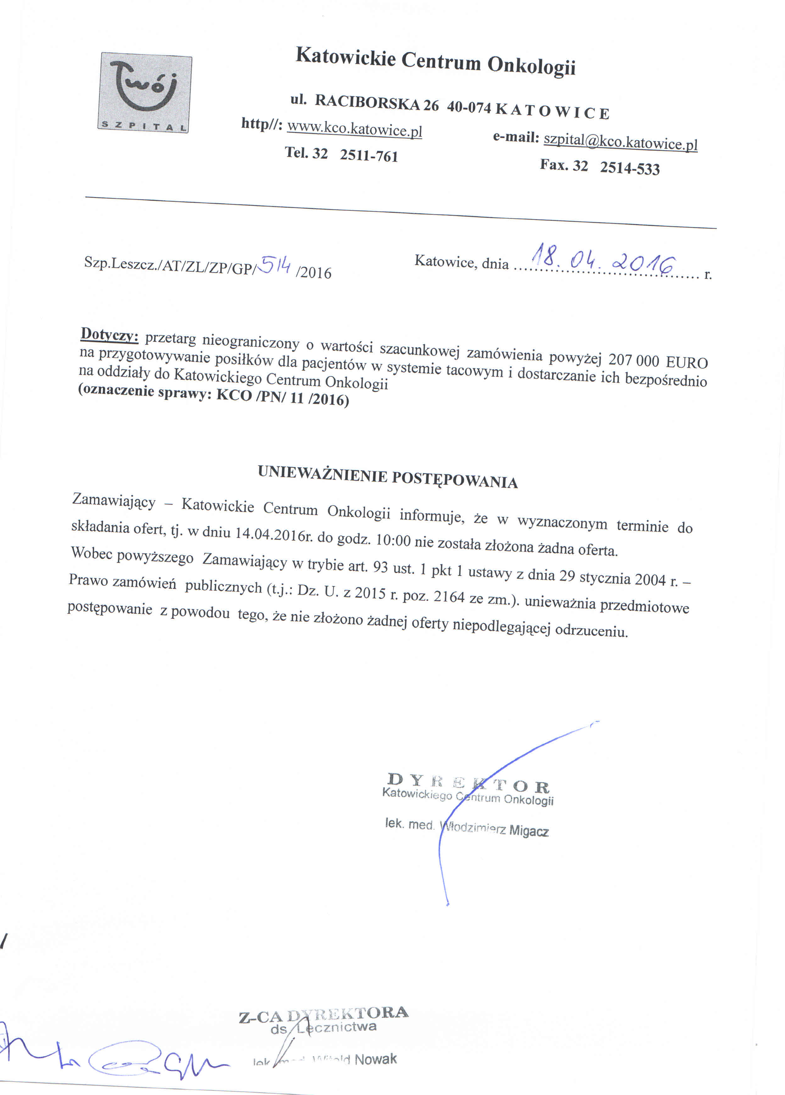 do dnia 14.04.2016 r. do godz. 10:00 w Kancelarii Dyrektora Katowickiego Centrum Onkologii w Katowicach przy ul. Raciborskiej 26 (I piętro).