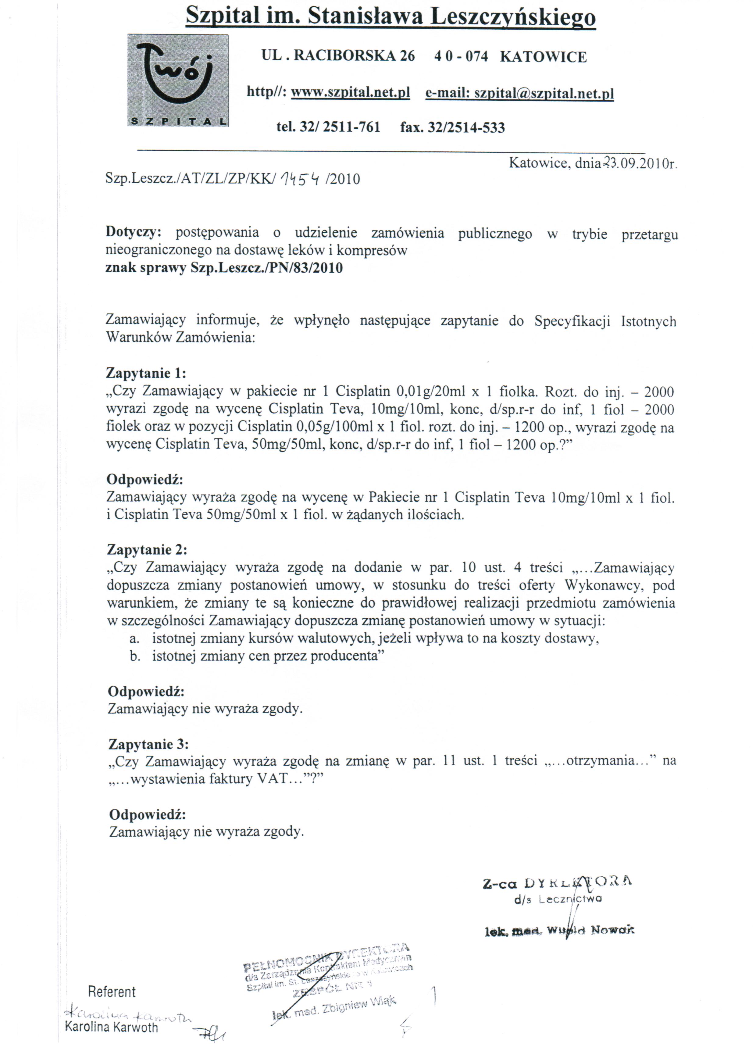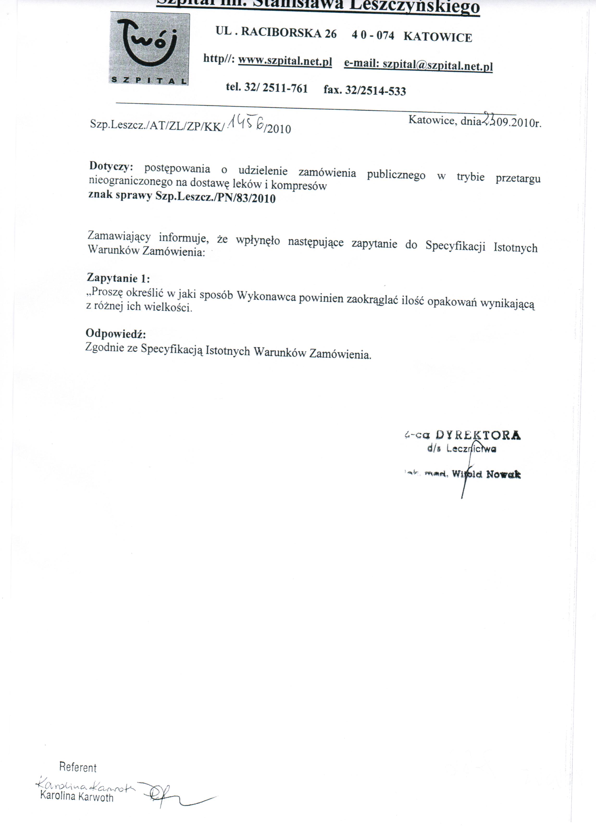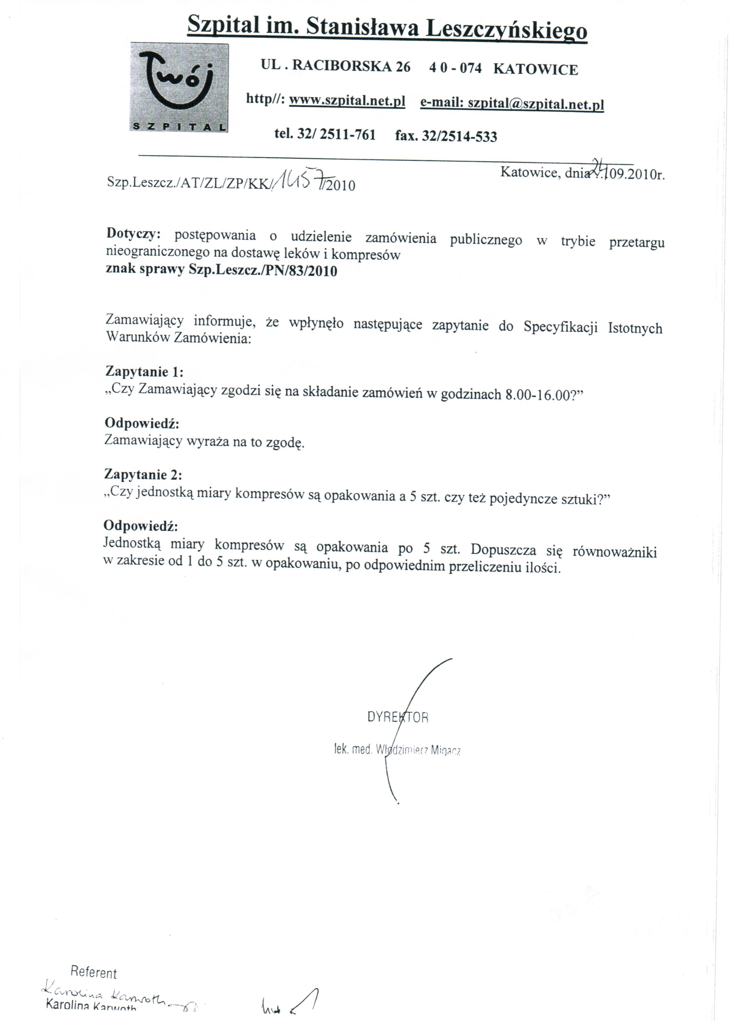 Otwarcie ofert nastąpi w dniu 24.09.2010r. o godz. 11:00 w 40-074 Katowice, ulica Raciborska 28, budynek Przychodni, II piętro, Sekcja Zamówień Publicznych.