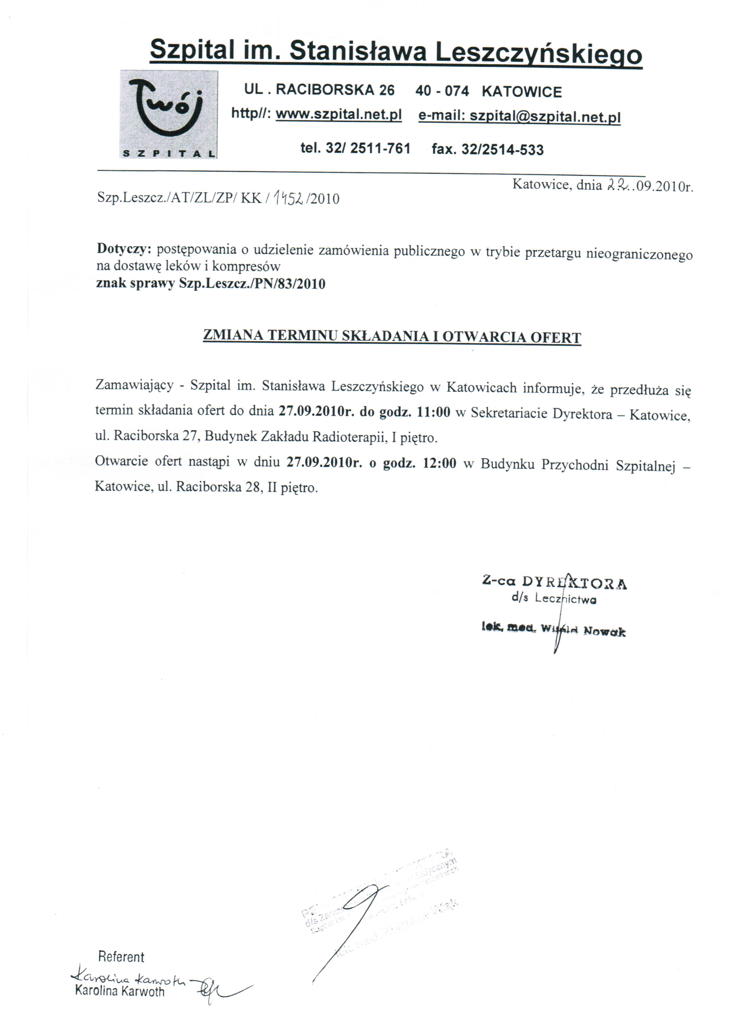 Oferty należy złożyć do dnia 24.09.2010r. do godz. 10:00 w 40-074 Katowice, ulica Raciborska 27, budynek Zakładu Radioterapii, I piętro, Sekretariat Dyrektora.