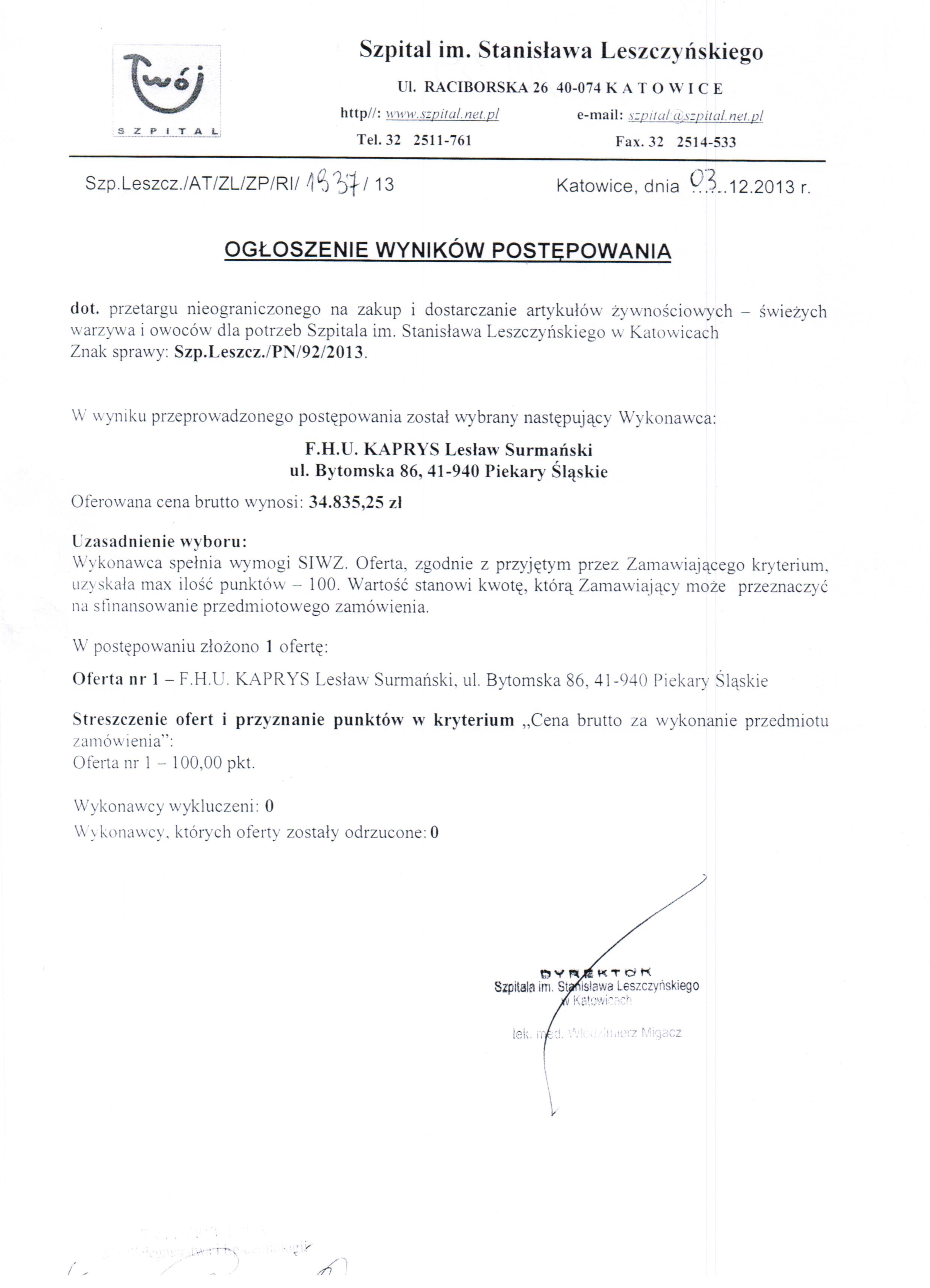 w dniu 27.11.2013 r. o godz. 12:00 w Szpitalu im. Stanisława Leszczyńskiego w Katowicach ul. Raciborska 28, budynek Przychodni, II piętro, Sekcja Zamówień Publicznych.