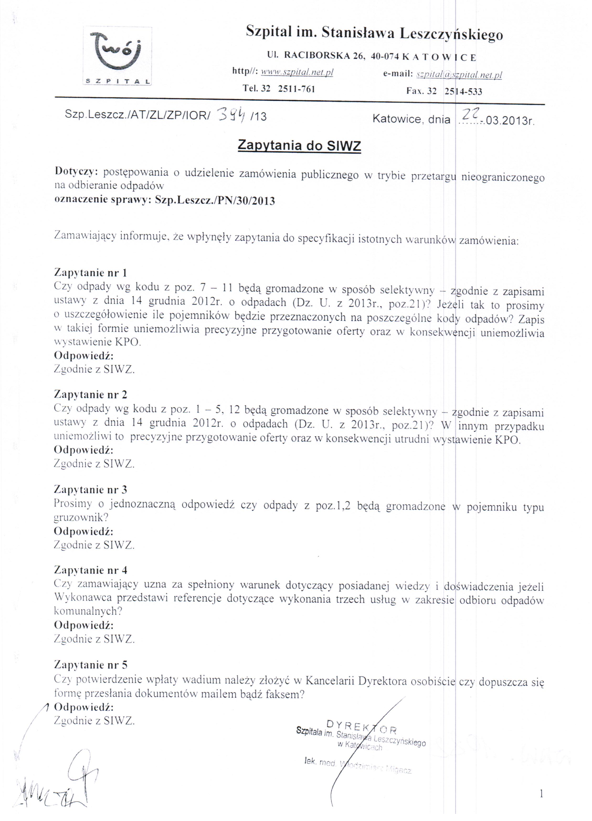 Przedmiotem zamówienia jest odbieranie odpadów z posesji należących do Szpitala im. Stanisława Leszczyńskiego w Katowicach o następujących kodach: