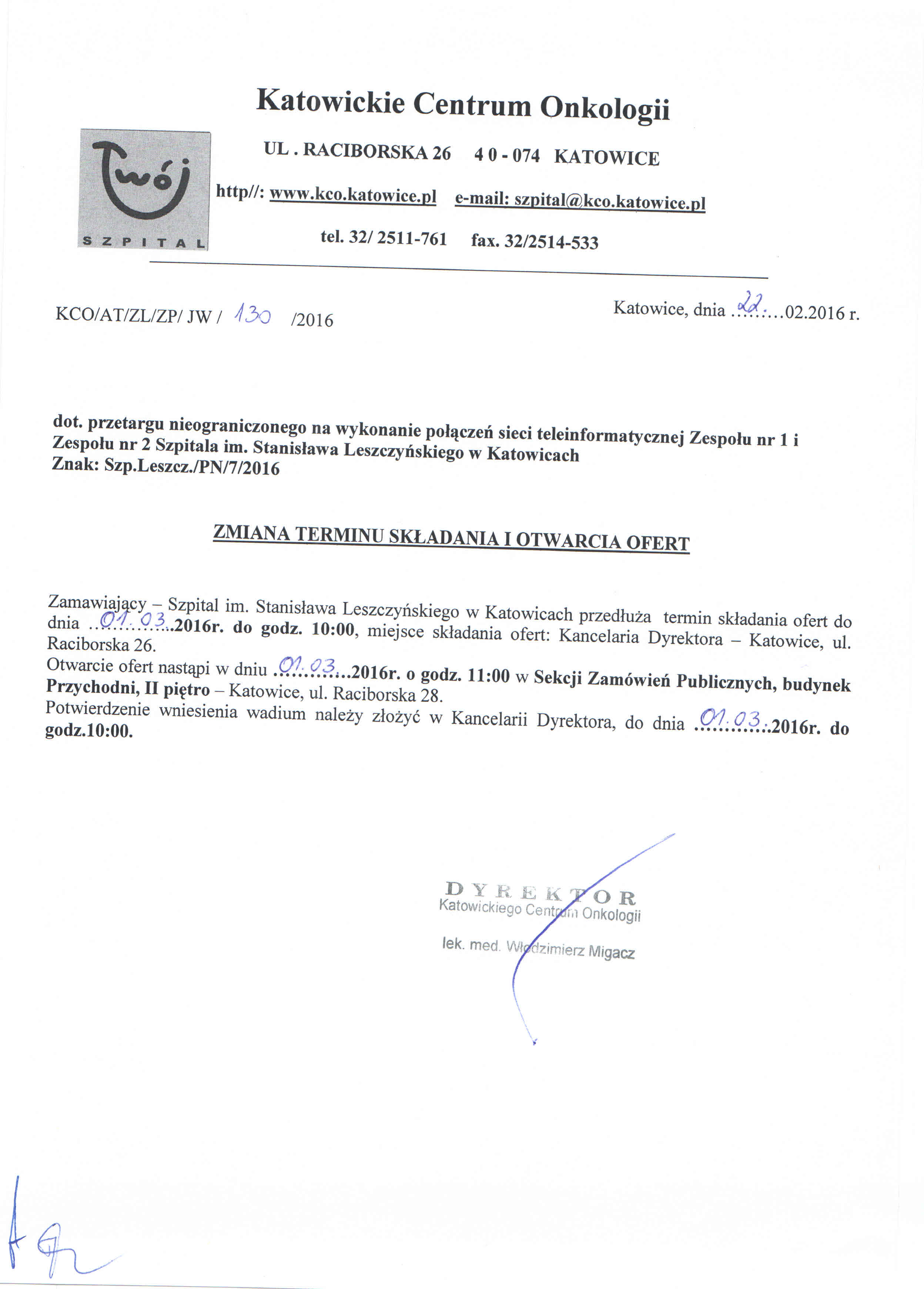 w dniu 23.02.2016r. o godz. 11:00 w 40-074 Katowice, ulica Raciborska 28, budynek Przychodni, II piętro, Sekcja Zamówień Publicznych.