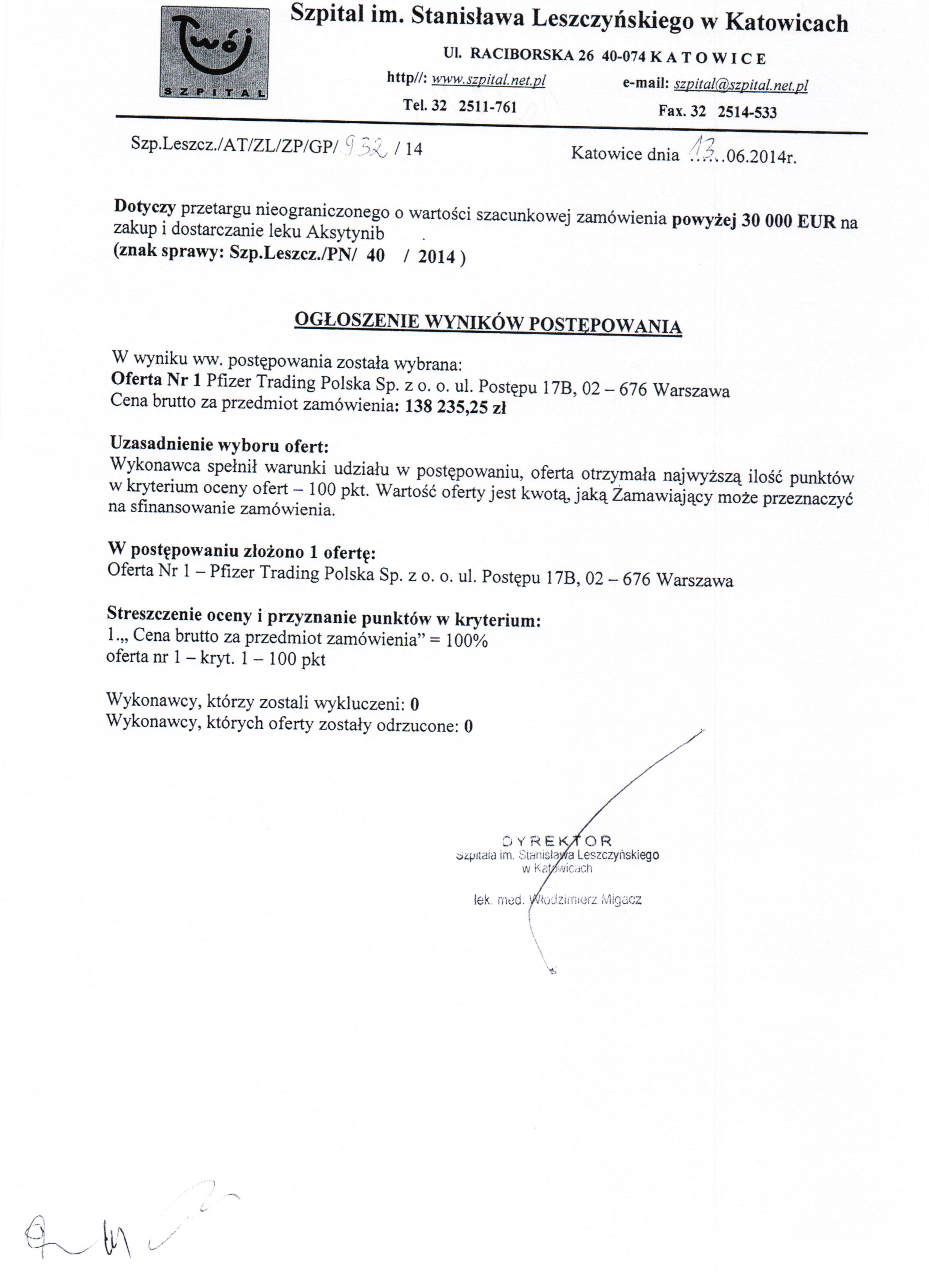Przedmiotem zamówienia jest zakup i dostarczanie leku Aksytynib dla potrzeb Szpitala im. Stanisława Leszczyńskiego w Katowicach w postaciach, dawkach i szacunkowych ilościach, których wykaz stanowi Załącznik Nr 2 do SIWZ – Oferta Cenowa.