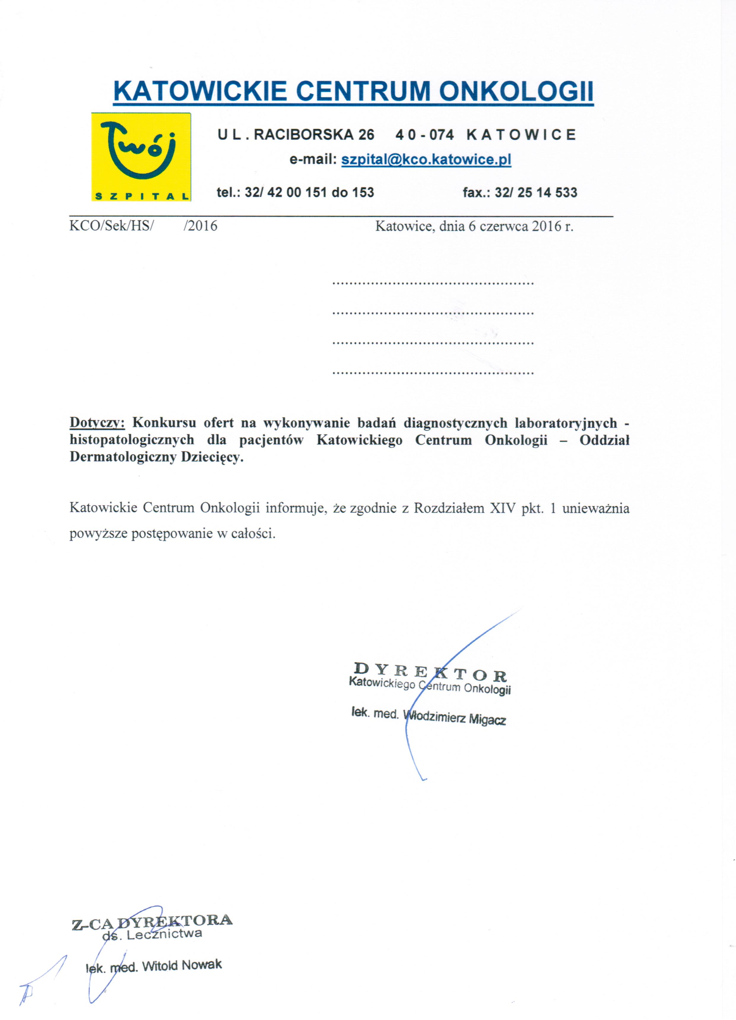 "Konkurs ofert - oferta na wykonywanie badań diagnostycznych laboratoryjnych - histopatologicznych dla pacjentów Katowickiego Centrum Onkologii – Oddział Dermatologiczny Dziecięcy".