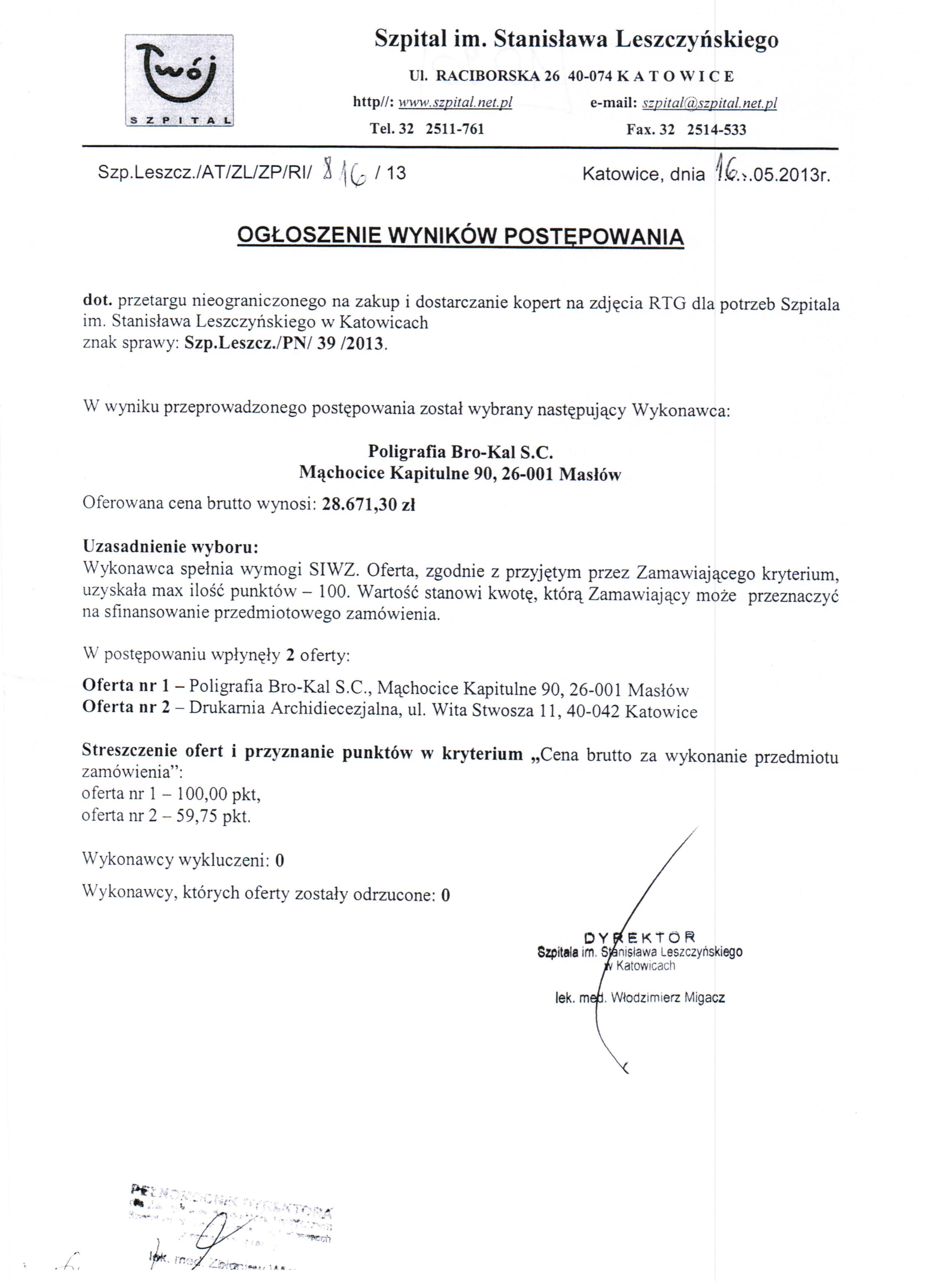 w dniu 25.04.2013 r. o godz. 11:00 w Szpitalu im. Stanisława Leszczyńskiego w Katowicach ul. Raciborska 28, budynek Przychodni, II piętro, Sekcja Zamówień Publicznych.