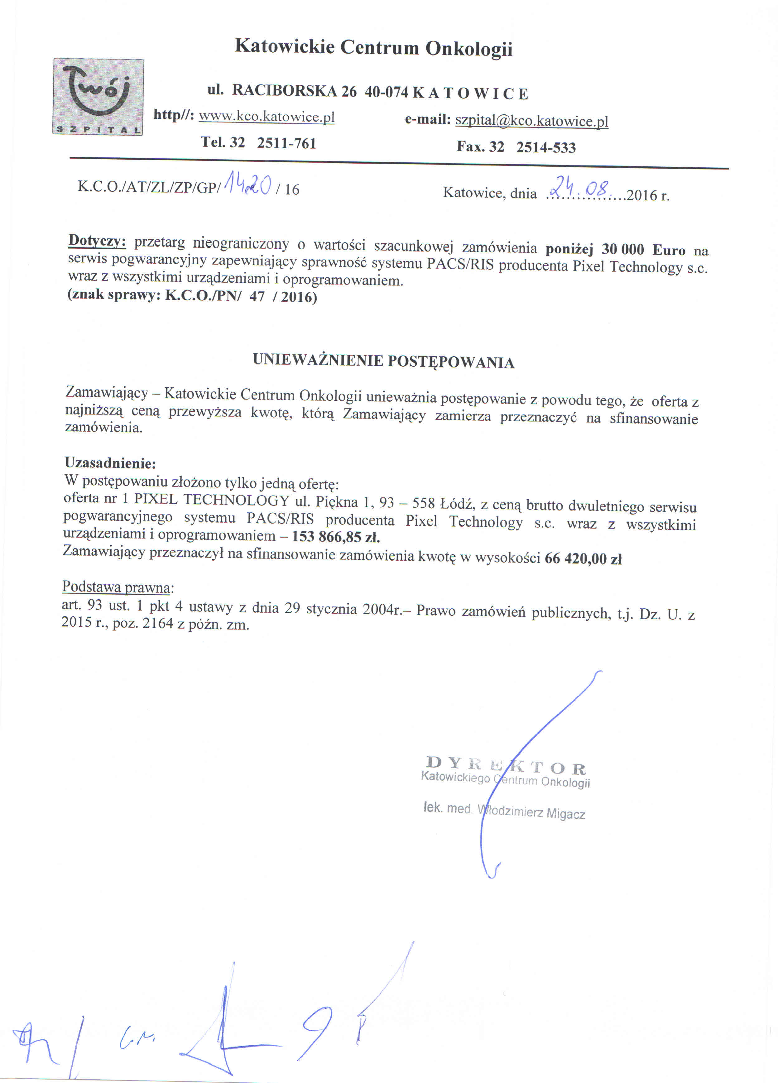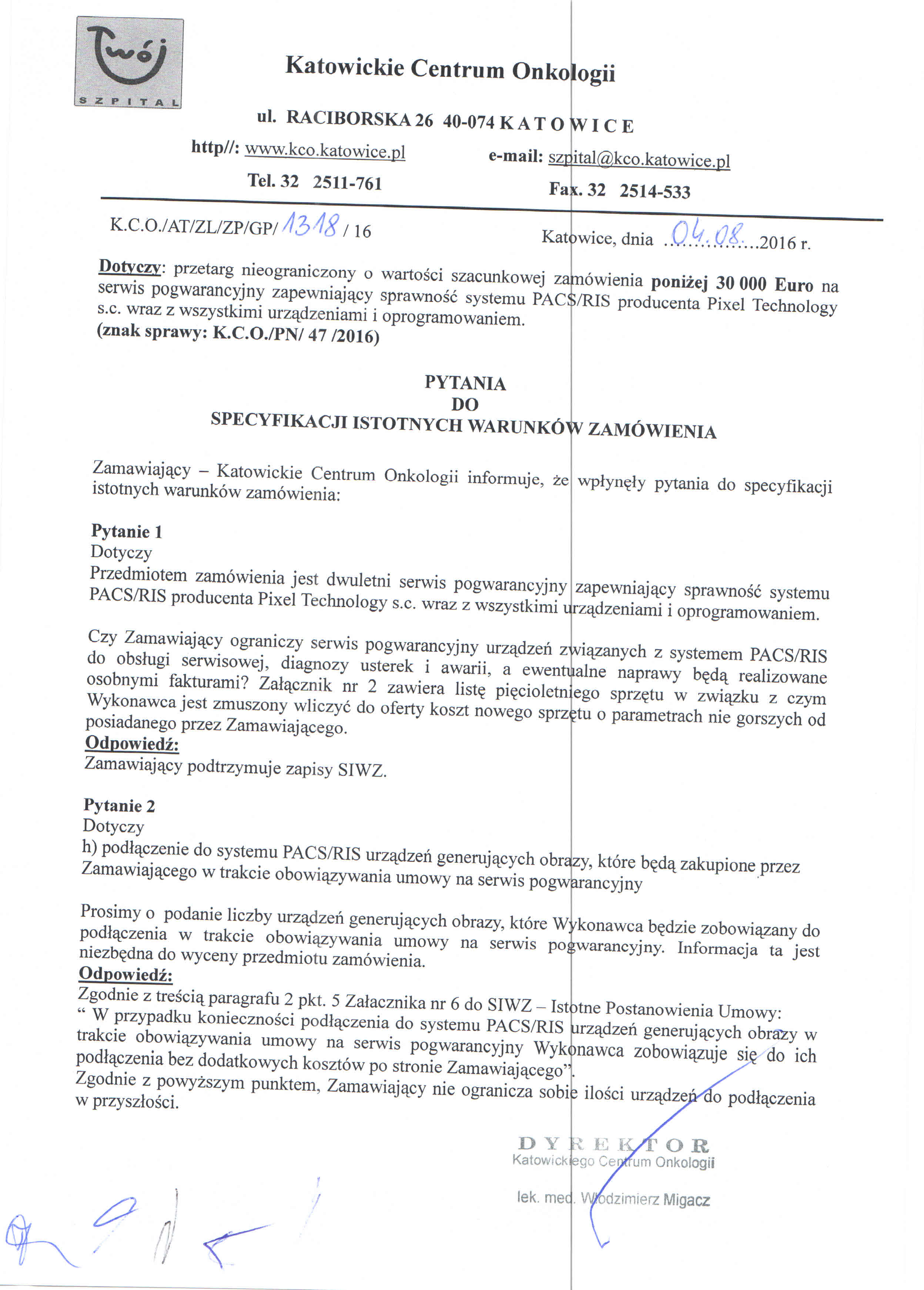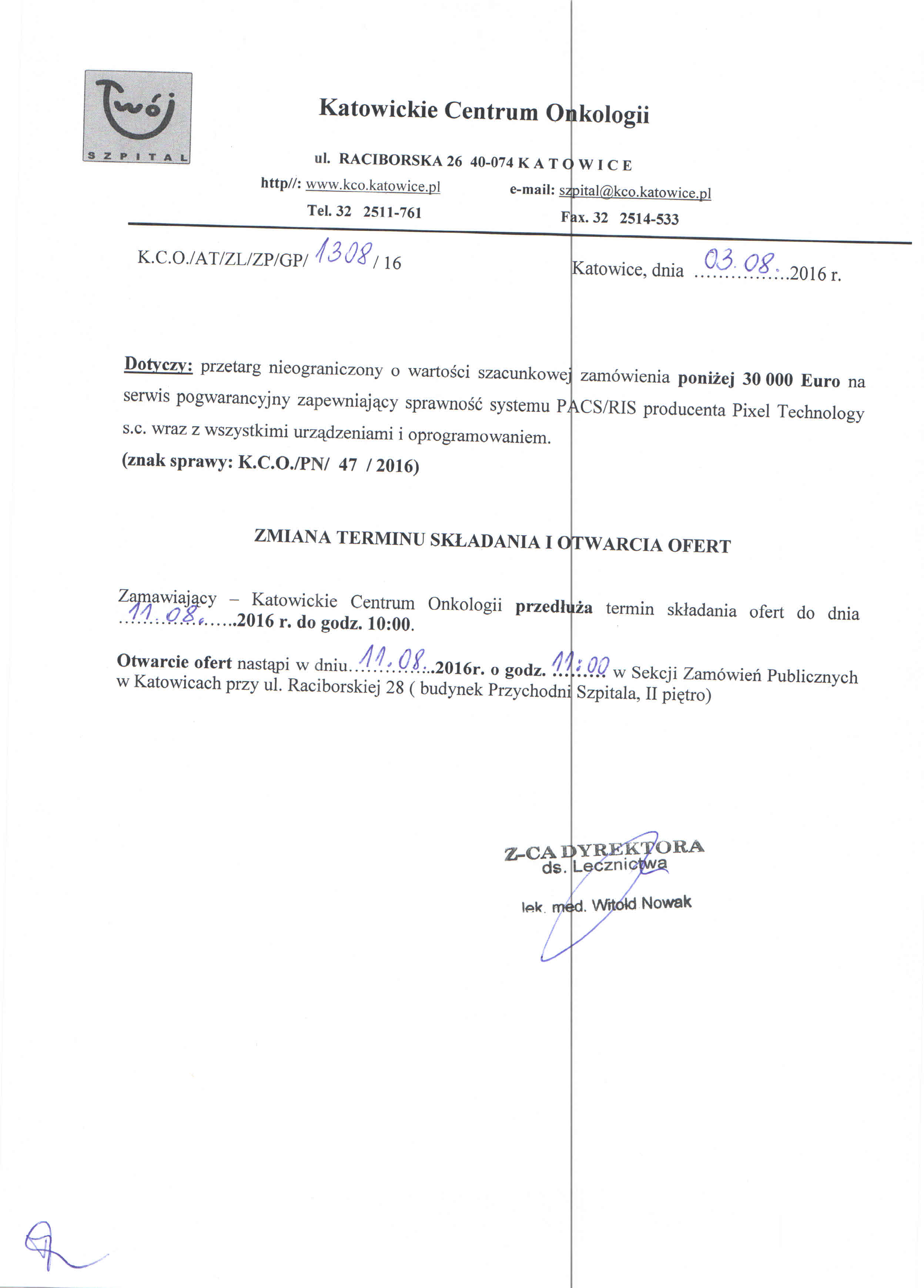 w dniu 05.08.2016r. o godz. 11:00 w Katowickim Centrum Onkologii, ul. Raciborska 28, budynek Poradni, II piętro, Sekcja Zamówień Publicznych.
