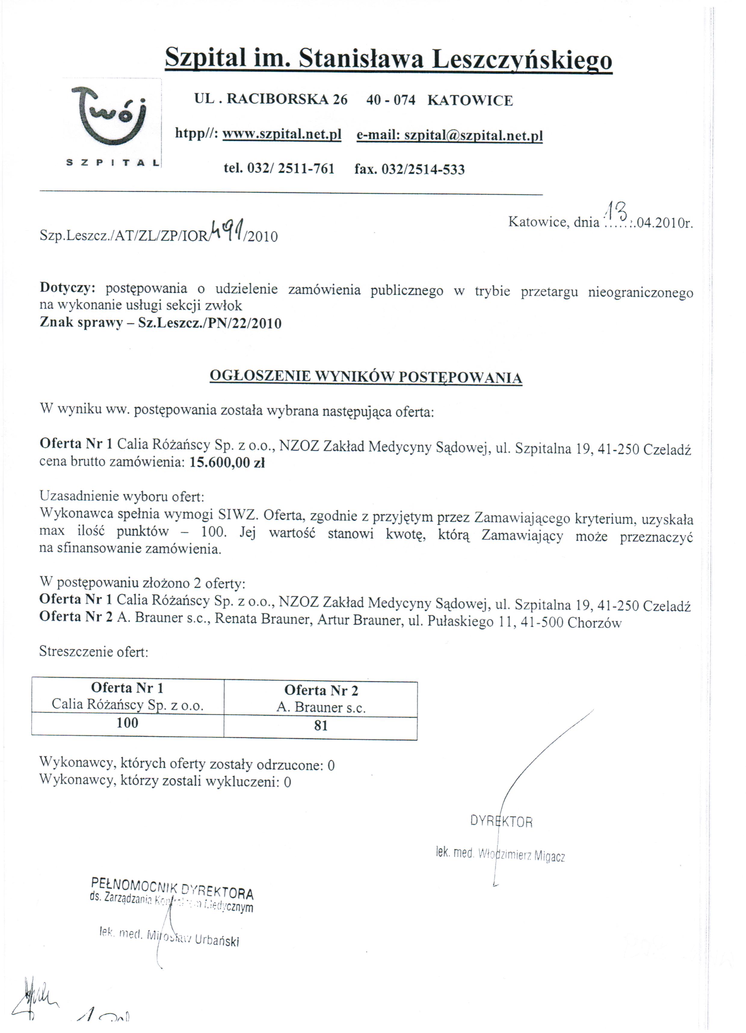 Oferty należy złożyć do dnia 29.03.2010r. do godz. 10:00 w Kancelarii Dyrektora Szpitala