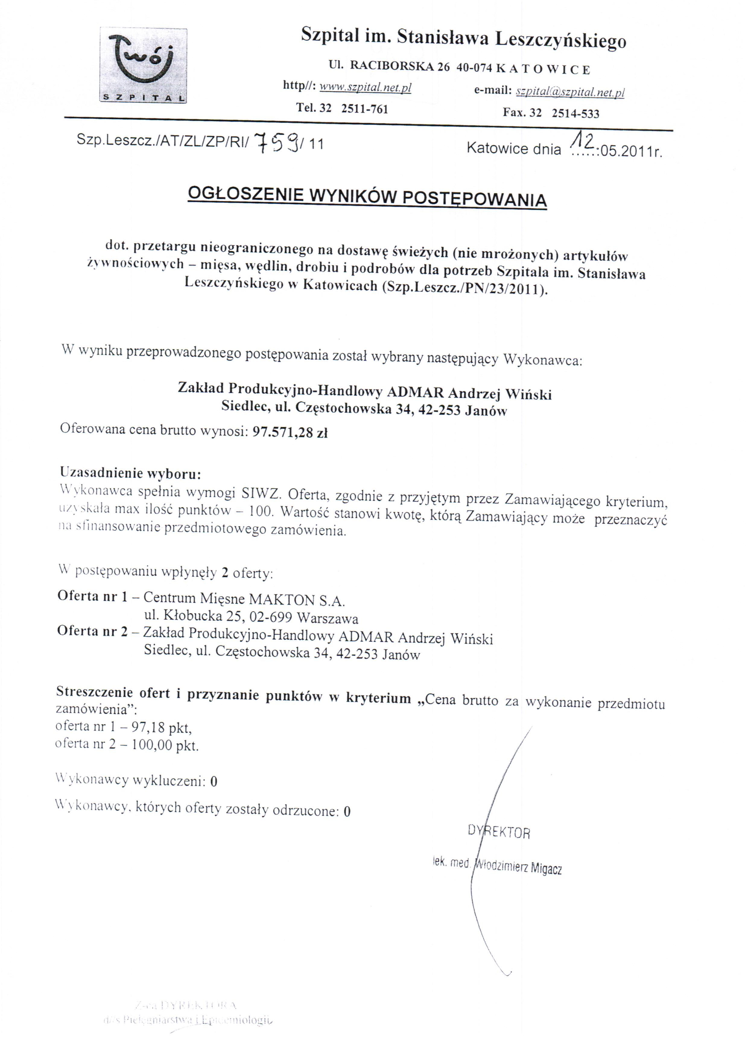 w dniu 27.04.2011r. o godz. 11:00 w Szpitalu im. Stanisława Leszczyńskiego w Katowicach, ul. Raciborska 28, budynek Przychodni, II piętro, Sekcja Zamówień Publicznych.