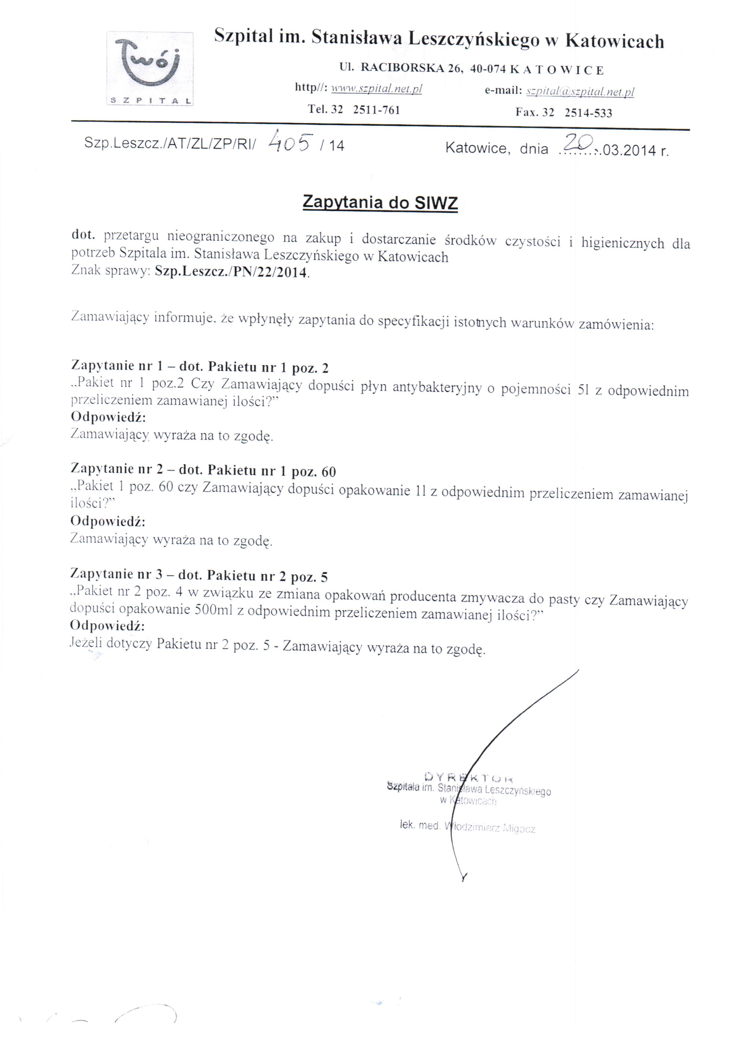 SIWZ można uzyskać pod adresem: Szpital im. Stanisława Leszczyńskiego w Katowicach, 40-074 Katowice, ul. Raciborska 26 – Dział Księgowości.