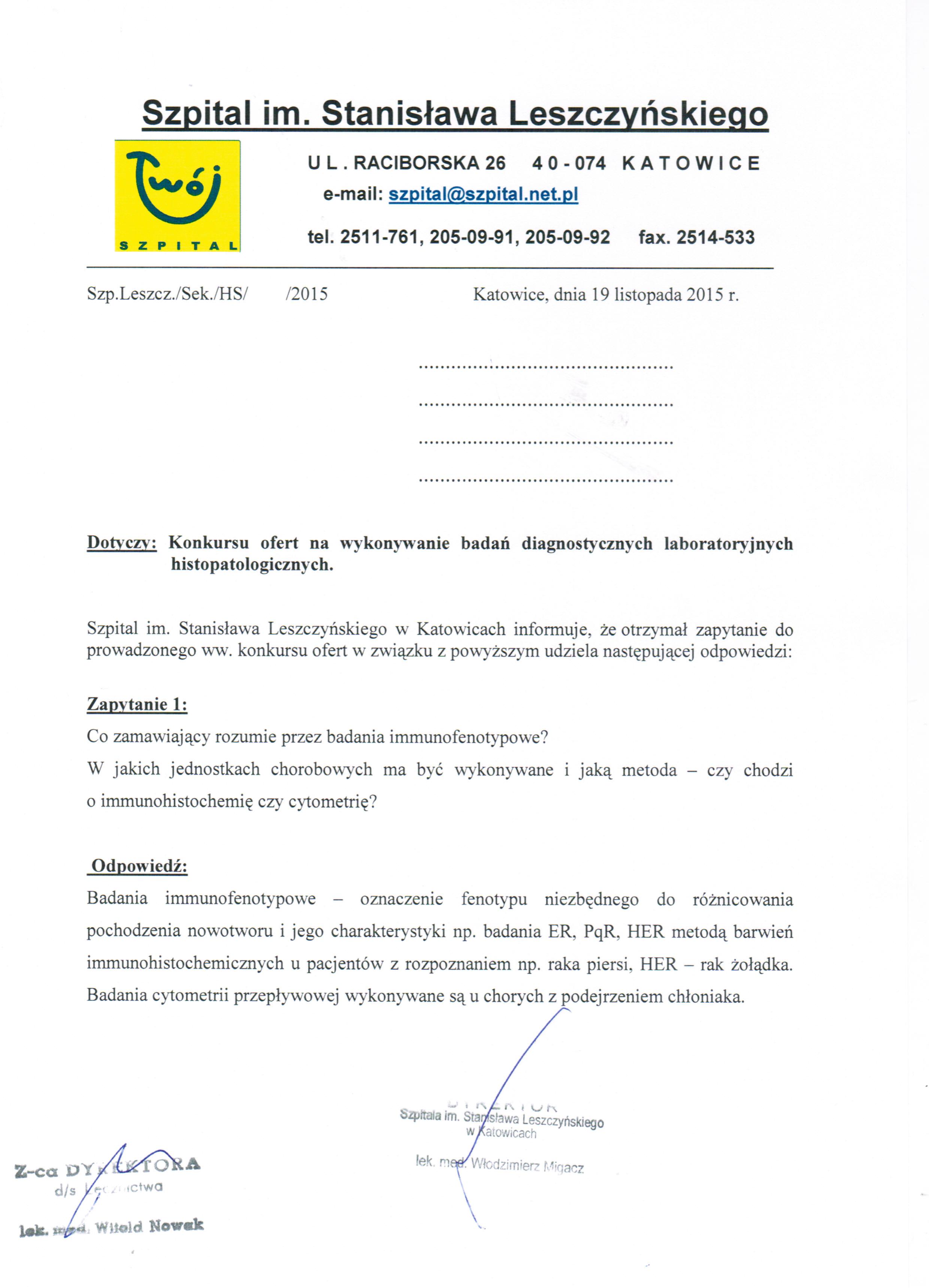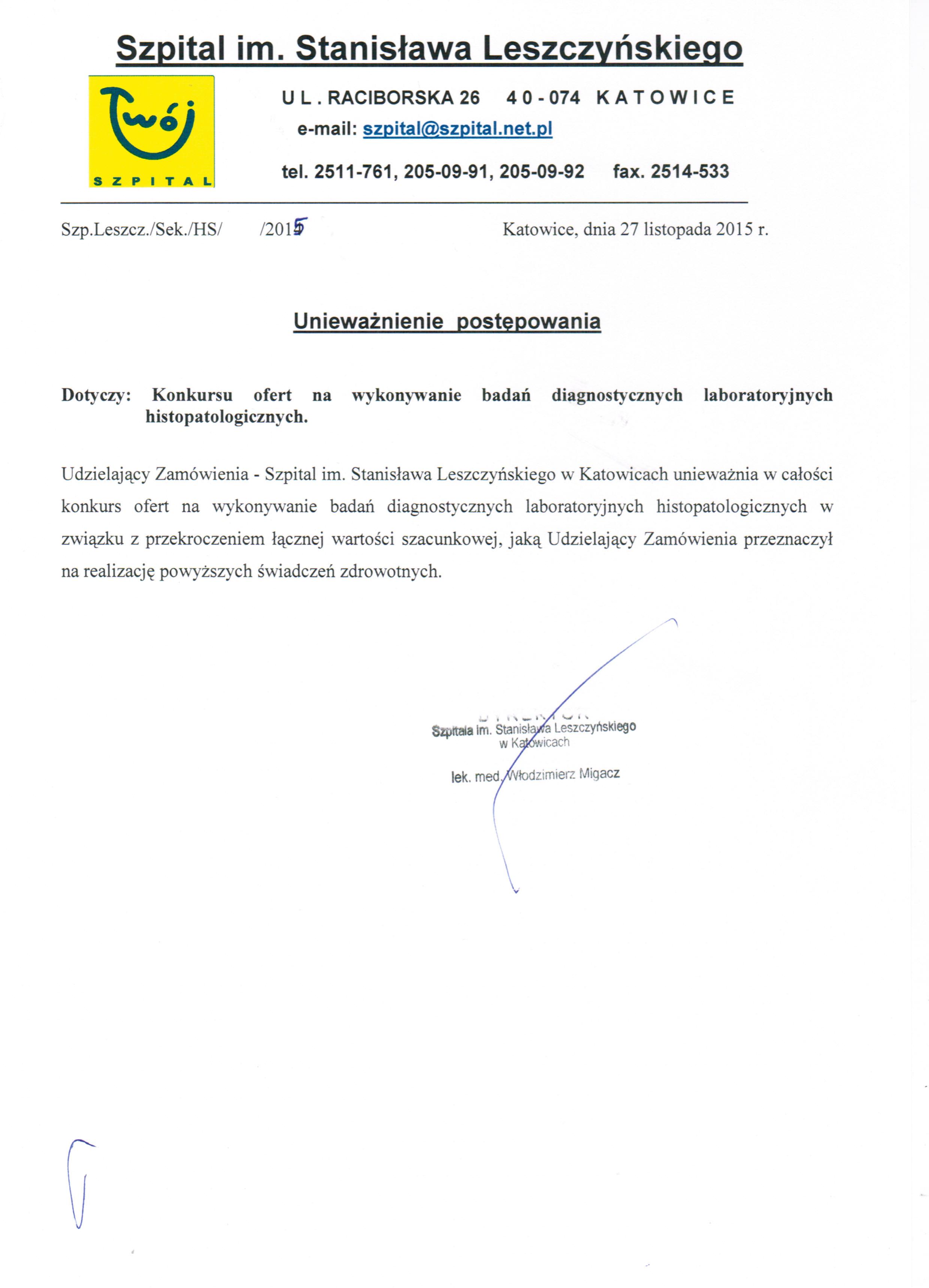 Szpital im. Stanisława Leszczyńskiego w Katowicach ul. Raciborska 26 zwany dalej Udzielającym Zamówienia ogłasza zamówienie na wykonywanie badań diagnostycznych laboratoryjnych histopatologicznych.
