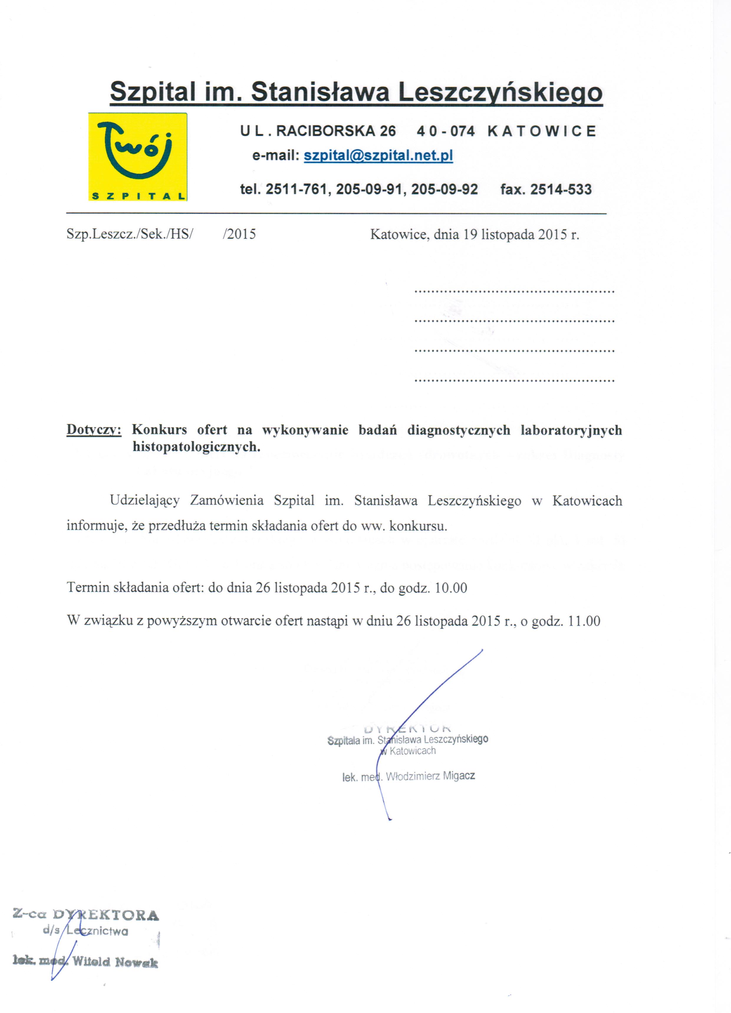 - Oferty należy składać w Kancelarii Szpitala im. Stanisława Leszczyńskiego w Katowicach ul. Raciborska 26 do dnia 20.11.2015 r. do godz. 10.00