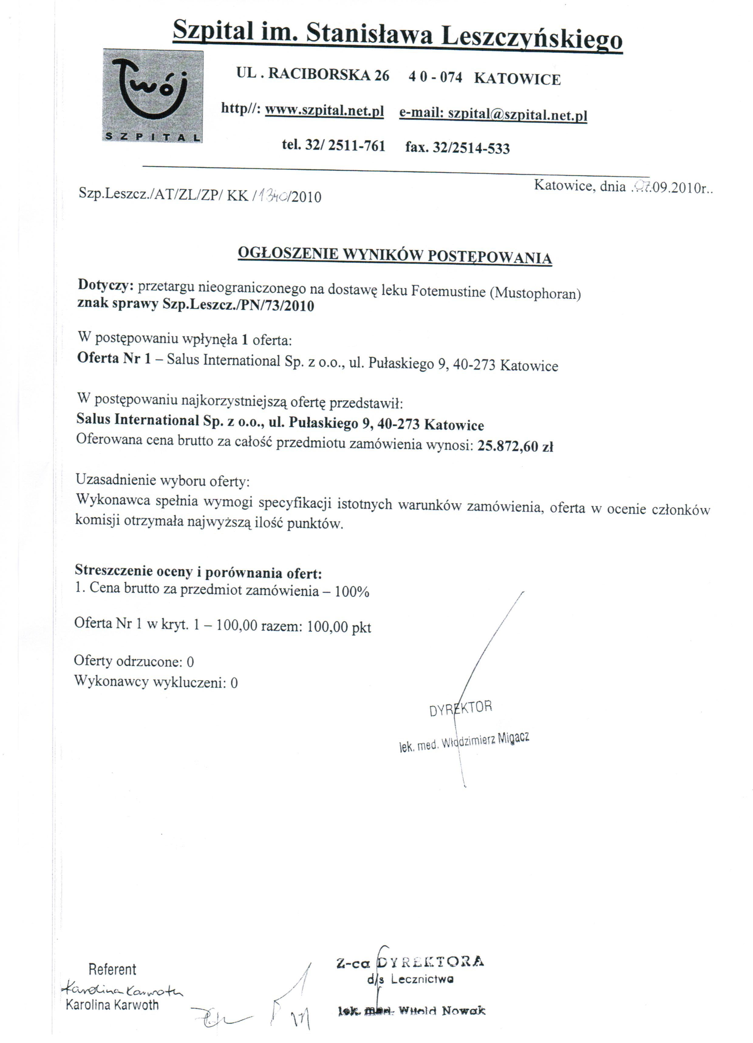 Oferty należy złożyć do dnia 03.09.2010r. do godz. 10:00 w 40-074 Katowice, ulica Raciborska 27, budynek Zakładu Radioterapii, I piętro, Sekretariat Dyrektora.