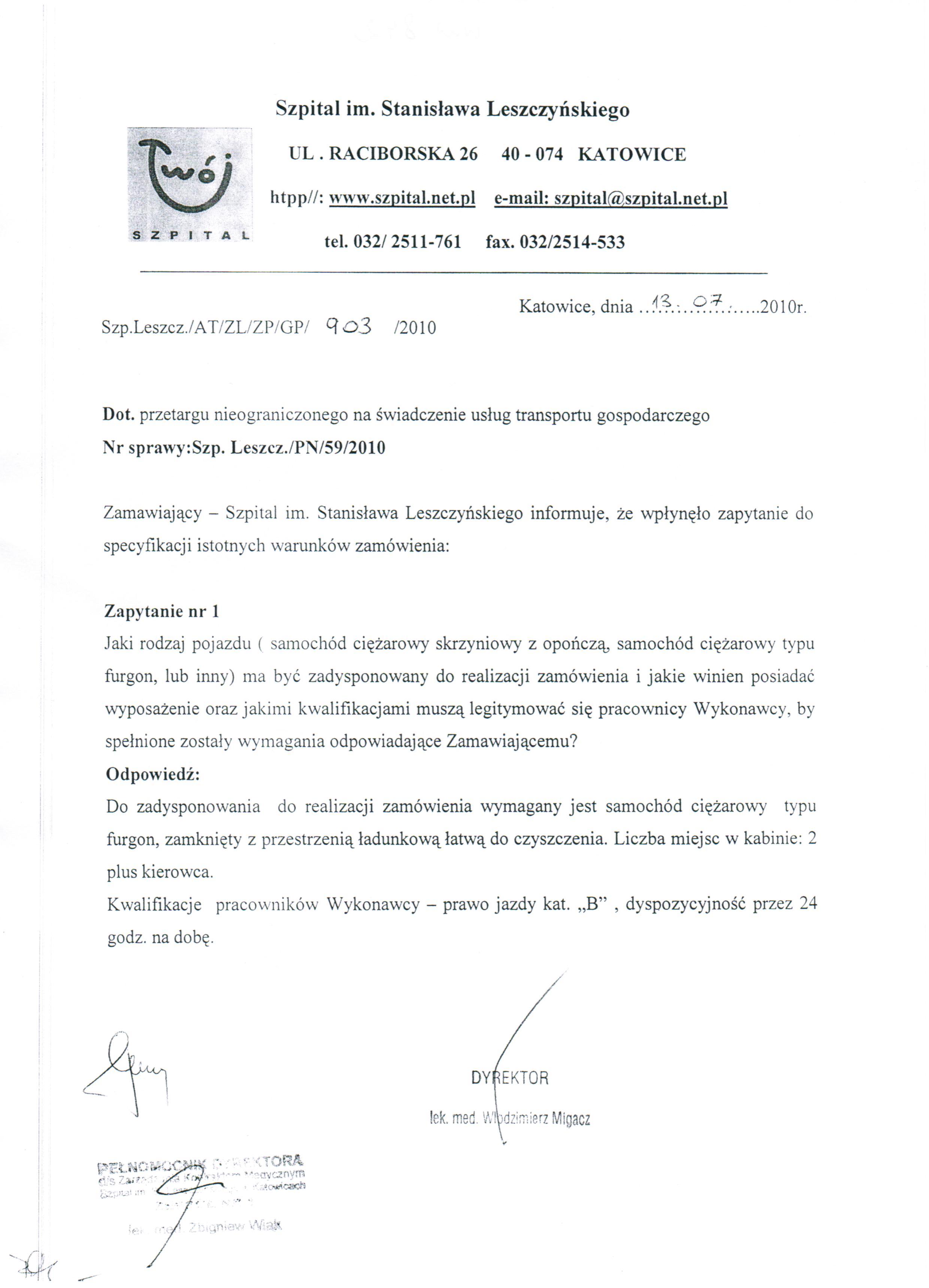 Oferty należy złożyć do dnia 19.07.2010r. do godz. 10:00 w Kancelarii Dyrektora Szpitala w Katowicach przy ul. Raciborskiej 26.