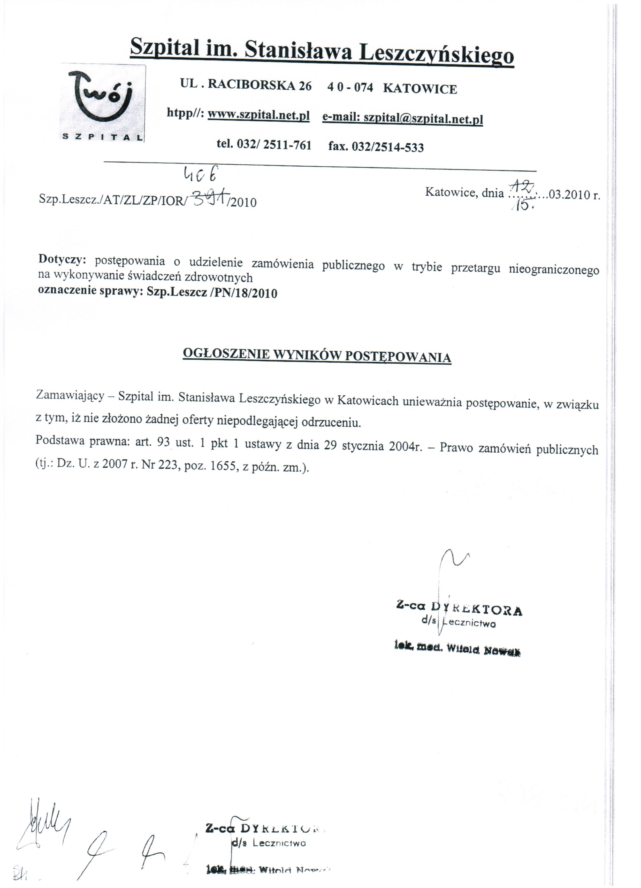 Oferty należy złożyć do dnia 10.03.2010r. do godz. 10:00 w Kancelarii Dyrektora Szpitala