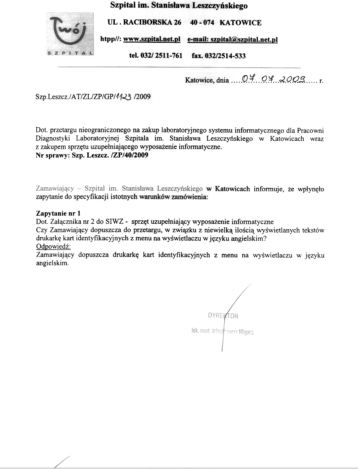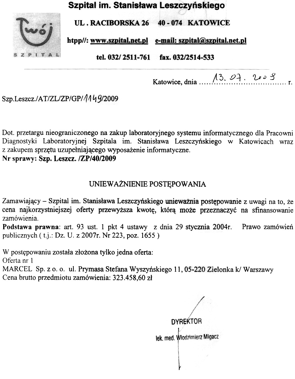 do dnia 09.07.2009r. do godz. 10.00 w Kancelarii Dyrektora Szpitala w Katowicach, przy ul. Raciborskiej 26.