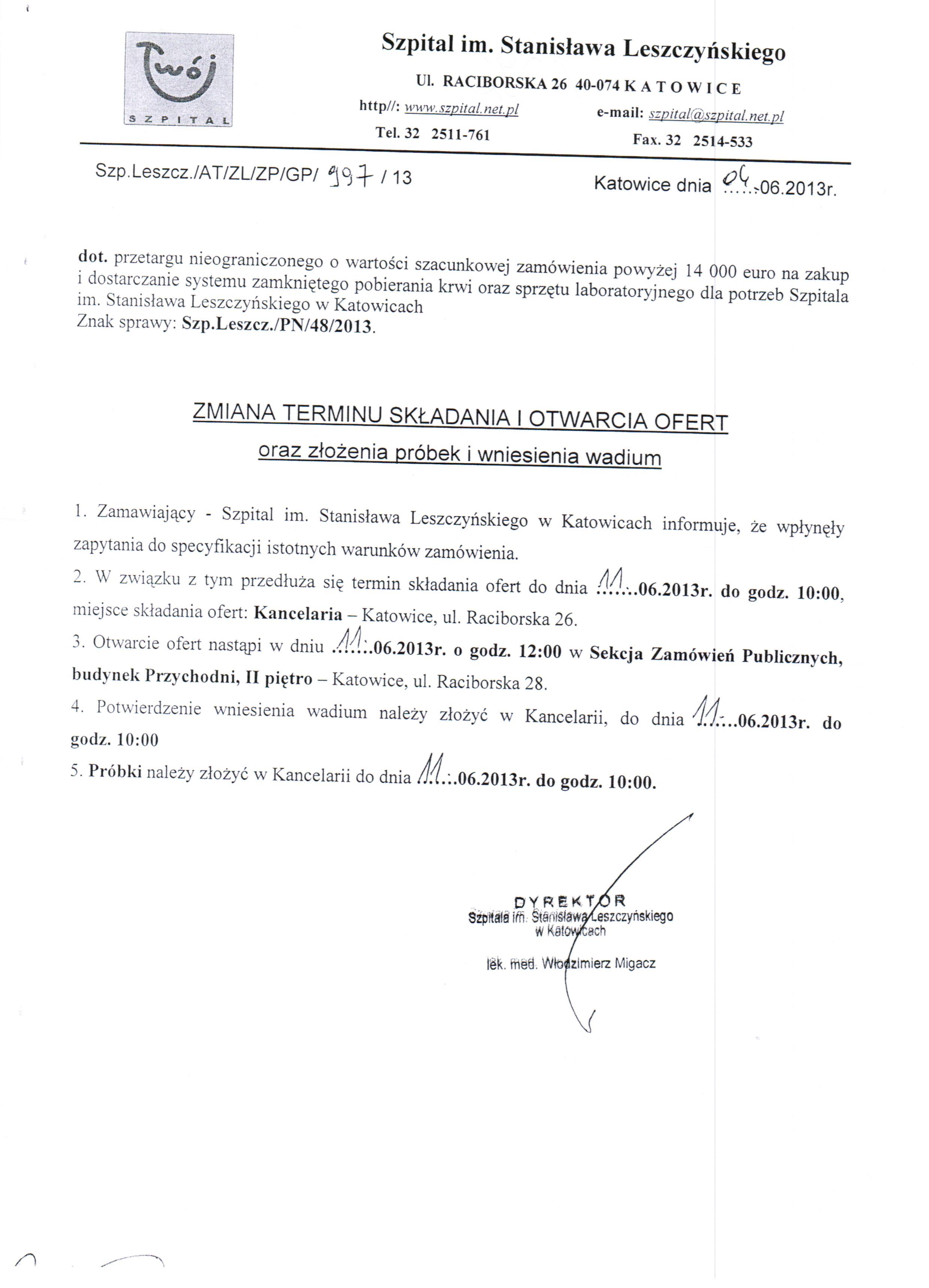 Otwarcie ofert nastąpi w dniu 06.06.2013r. o godz. 11:00 w 40 – 074 Katowice, ulica Raciborska 28, budynek Przychodni, II piętro, Sekcja Zamówień Publicznych.