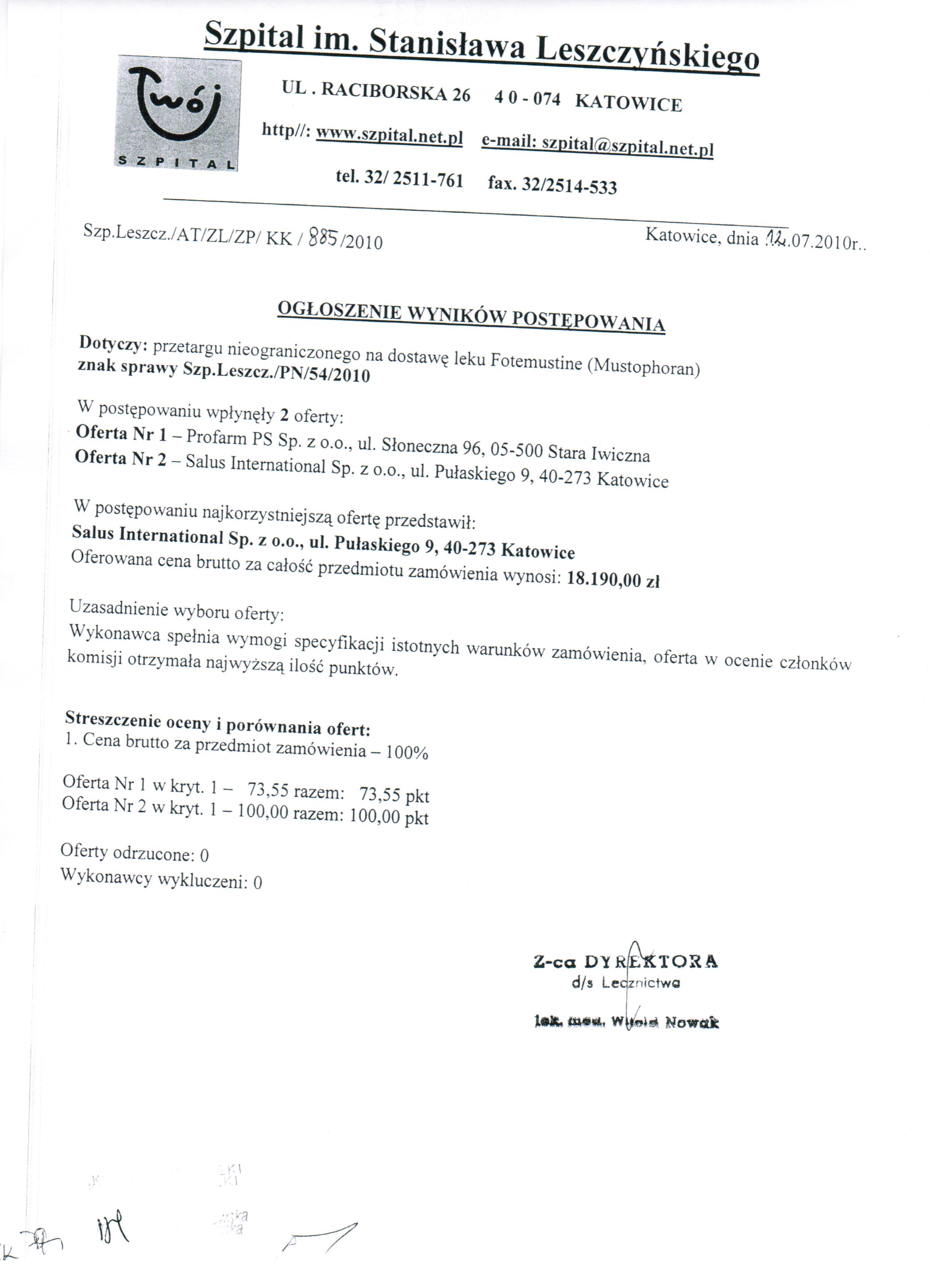 Oferty należy złożyć do dnia 08.07.2010r. do godz. 09:00 w Kancelarii Dyrektora Szpitala w Katowicach przy ul. Raciborskiej 26.