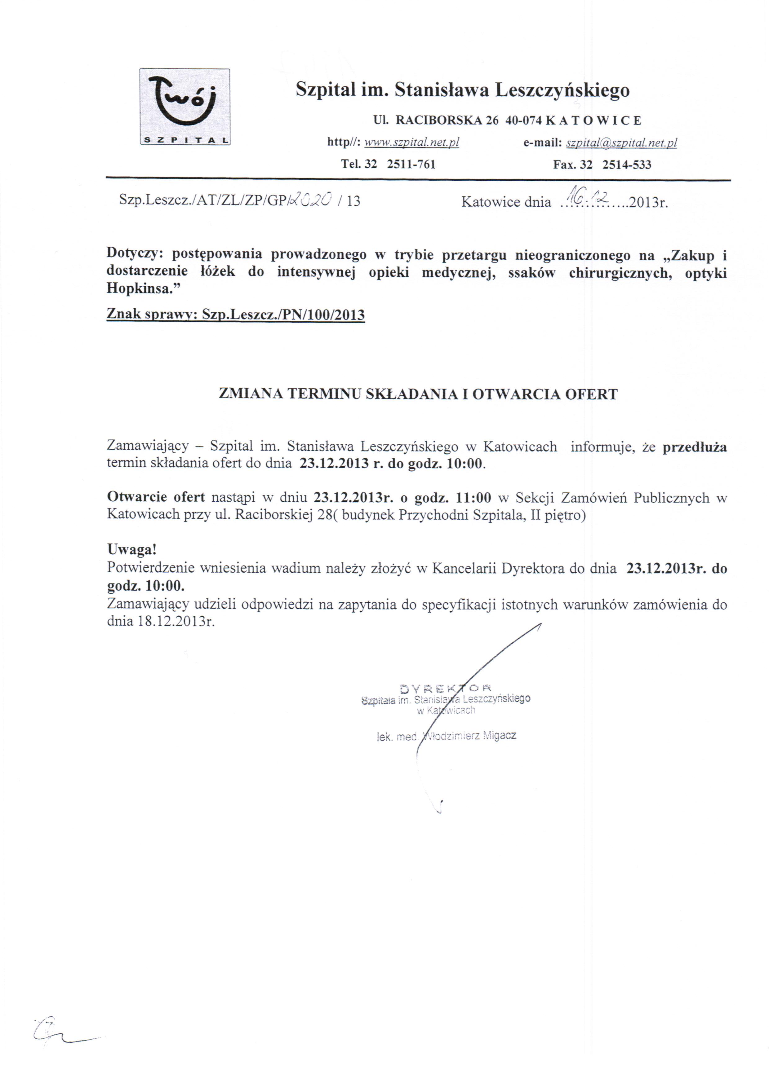 w dniu 17.12.2013r. o godz. 11:00 w 40-074 Katowice, ulica Raciborska 28, budynek Przychodni, II piętro, Sekcja Zamówień Publicznych.