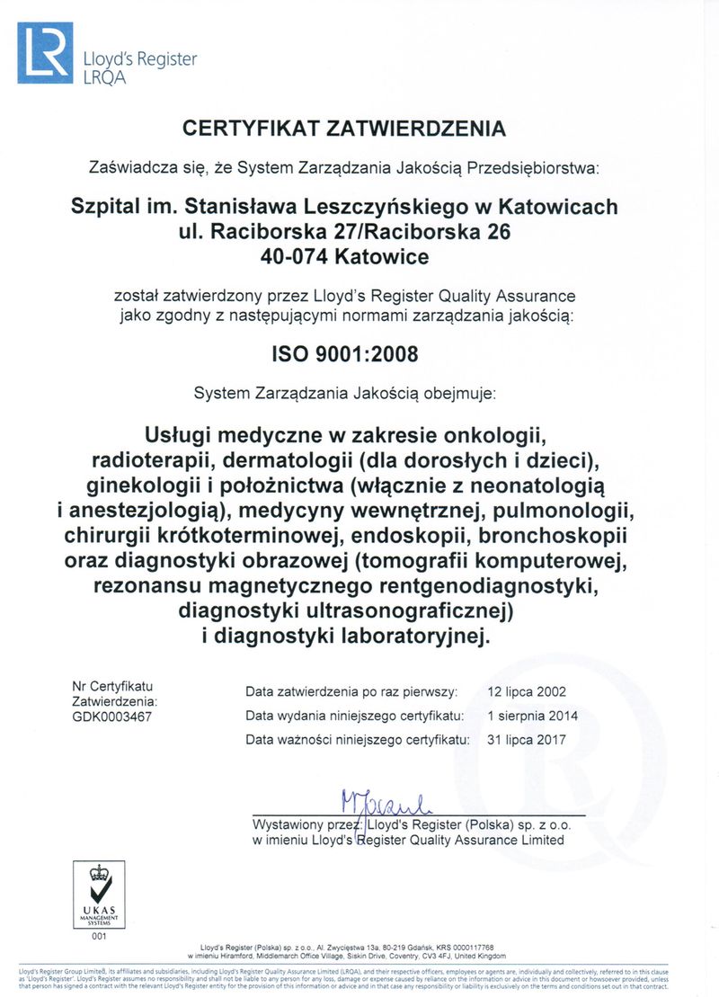Szpital im. Stanisława Leszczyńskiego w Katowicach informuje, że System Zarządzania Jakością Przedsiębiorstwa: Szpital im. Stanisława Leszczyńskiego w Katowicach, został zatwierdzony przez Lloyd's Register Quality Assurance jako zgodny z następującymi normami zarządzania jakością: ISO 9001:2008